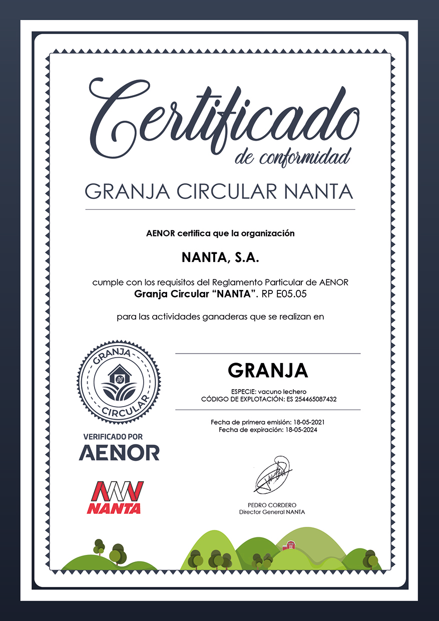 Nanta clasifica las granjas en 3 categorías en función de sus resultados de sostenibilidad (A, B y C). Son las granjas merecedoras de una calificación A, aquellas que recopilan todos los aspectos de sostenibilidad contemplados en el modelo, las que obtienen el Certificado de Conformidad de Aenor. Esta calificación permitirá el uso durante tres años de la certificación de Granja Circular verificado por Aenor. Actualmente, doce granjas ya han obtenido esta certificación.