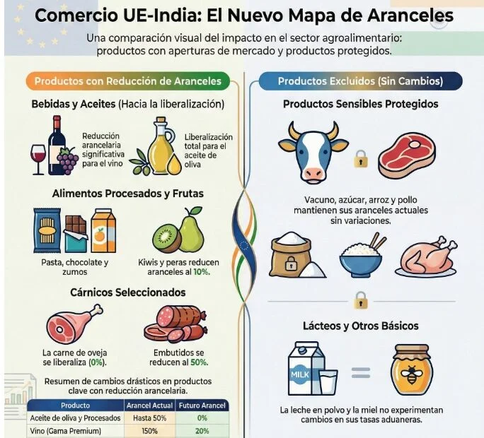 El acuerdo abre oportunidades para sectores concretos, como el vino y el aceite de oliva, que verán reducidos de forma significativa unos aranceles que hasta ahora superaban el 150 % en el caso del vino y el 45 % en el del aceite de oliva. ASAJA reconoce el interés de este acceso a un mercado de más de 1.400 millones de consumidores, especialmente para producciones de alto valor añadido.