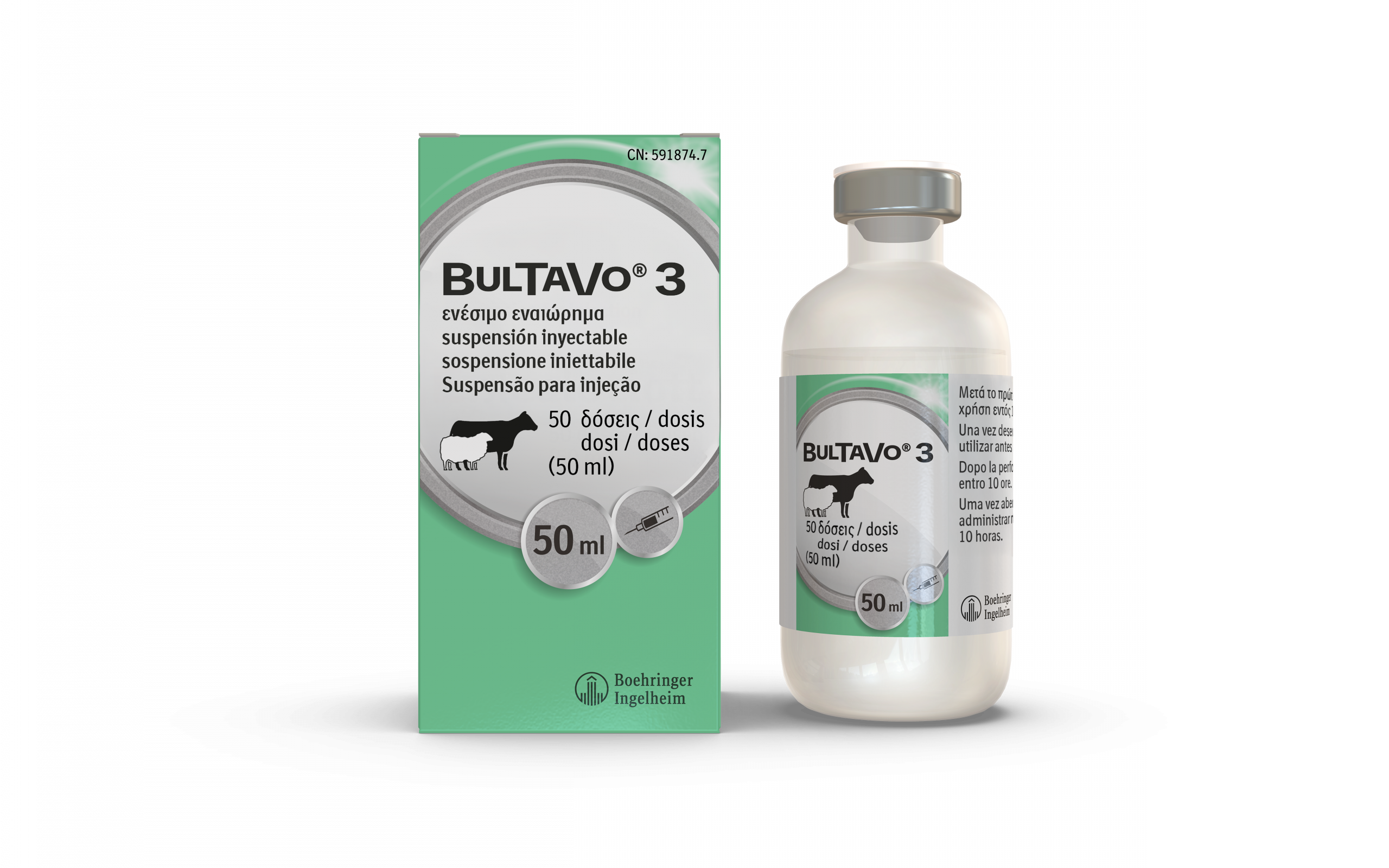 BULTAVO® 3 suspensión inyectable para ovino y bovino. Composición: Cada dosis (1 ml) contiene: Virus de la lengua azul, serotipo 3, cepa Bio-93: BTV3, inactivado 10 – 320 unidades ELISA. Especies de destino: Ovino y bovino. Indicaciones: Ovino: Inmunización activa para reducir la viremia y prevenir los signos clínicos causados por el serotipo 3 del virus de la lengua azul (VLA). Bovino: Inmunización activa para prevenir la viremia y los signos clínicos causados por el serotipo 3 del virus de la lengua azul (VLA). Establecimiento de la inmunidad: 3 semanas después de la primovacunación. Duración de la inmunidad: no se ha establecido. Contraindicaciones: Ninguna. Gestación y lactancia: Puede utilizarse durante la gestación. No ha quedado demostrada la seguridad del medicamento veterinario durante la lactancia. Acontecimientos adversos: Frecuentes: Temperatura elevada e hinchazón en el punto de inyección. Muy raros: Reacción anafilactoide. Posología: Administrar una dosis de 1 ml, por vía subcutánea en ovino, y por vía intramuscular en bovino. En ovino: una inyección a partir de 1 mes de edad en animales no expuestos. En bovino: una 1ª inyección a partir de 1 mes de edad en animales no expuestos y una 2ª inyección 3 semanas después de la primera inyección. Precauciones: Vacunar únicamente animales sanos. La inmunización básica debe iniciarse a tiempo para que la protección se haya desarrollado completamente al comienzo del período de riesgo para el animal. Tiempos de espera: Cero días. Conservación: Conservar y transportar refrigerado (entre 2 °C y 8 °C). No congelar. Proteger de la luz. N.º autorización: 4400 ESP. Autorización de comercialización en circunstancias excepcionales. Formatos: Caja de cartón con 1 vial de 50 dosis. Titular: Boehringer Ingelheim Vetmedica GmbH. Medicamento sujeto a prescripción veterinaria. En caso de duda consulte a su veterinario.