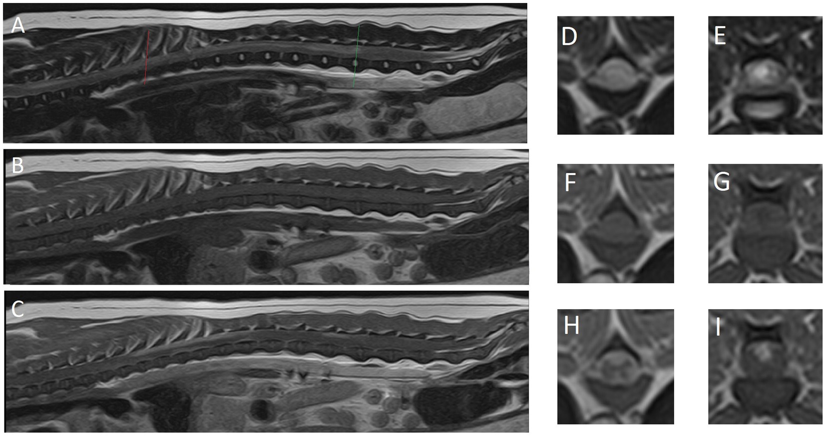 Se realizó un estudio de resonancia magnética de alto campo (RM; 1,5 T Canon Vantage Elan) de la médula espinal toracolumbar desde el nivel de la 1ª vértebra torácica hasta el sacro bajo anestesia general. La premedicación incluyó 0,4 mg/kg de metadona y 6 μg/kg de dexmedetomidina, seguidos de 3 mg/kg de propofol en bolos para la inducción de la anestesia. Se utilizó isoflurano al 2-3% para el mantenimiento del plano anestésico. Las secuencias realizadas incluyeron: sagital ponderada en T2 (T2W), recuperación sagital de la inversión tau corta (STIR), T1W sagital, STIR dorsal, T2W transversal, T1W transversal, T2* transversal, T1W post-contraste transversal, T1W post-contraste sagital 3D y T1W post-contraste transversal con saturación de grasa. Las imágenes de RM no revelaron signos de enfermedad del disco intervertebral, la señal del núcleo pulposo de todos los discos intervertebrales fotografiados era T2 hiperintensa. Se observó una lesión intramedular irregular y mal definida, de extensión variable, pero observada desde T1 hasta L4 (Figura 1). Tanto la materia gris como la blanca se vieron afectadas. Toda el área de la sección transversal del cordón se vio afectada a nivel de T9. La lesión era heterogénea, de moderada a marcada T2W hiperintensa en comparación con el resto de la médula y T1W isointensa. El parénquima de la médula espinal mostró un realce moderado y parcheado del contraste de T7 a T12 y de L1 a L3. El cordón parecía hinchado a esos niveles y las meninges circundantes estaban engrosadas y aumentaban el contraste, incluido el realce a lo largo de la fisura medial ventral a nivel de T9. Una punción lumbar de LCR no tuvo éxito.