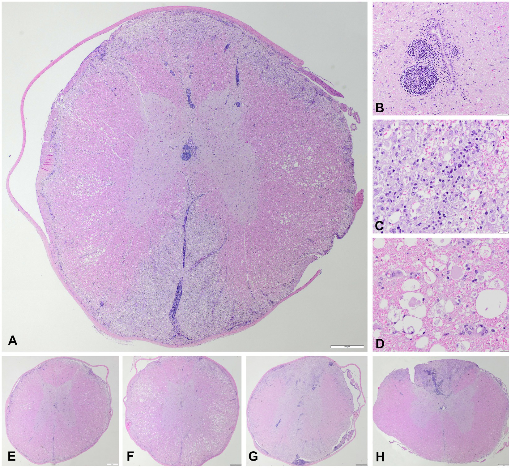 El examen microscópico de cinco secciones de médula espinal T3-L3 teñidas con hematoxilina y eosina confirmó un proceso inflamatorio restringido principalmente a la sustancia blanca de la médula espinal y a las leptomeninges (Figura 2). Este proceso se caracterizó por una leucoencefalitis necrotizante severa bilateral y bastante simétrica (Figura 2A) con manguitos linfocitarios perivasculares (Figura 2B). En el epicentro de las lesiones, en los segmentos T9-T12, los funículos dorsal y ventromedial presentaban palidez marcada y eran hipercelulares. Un gran número de histiocitos infiltraron, comprimieron y borraron las fibras nerviosas en esos lugares, borrando totalmente la arquitectura de la sustancia blanca espinal. Numerosos axones estaban agrandados (esferoides), y había vainas de mielina vacías, y la descomposición de la mielina acompañada de grandes macrófagos, células gitter que se encuentran dentro de vainas de mielina dilatadas que contienen restos axonales, todo mezclado con unos pocos linfocitos y neutrófilos (Figuras 2C, D). Lesiones inflamatorias granulomatosas similares también afectaron circunferencialmente a la sustancia blanca más submeníngea y superficial, que aparece pálida, edematosa e hipercelular. No se encontraron tales lesiones en la sustancia gris de la médula espinal. En T9-T12, la visualización de las meninges confirmó la presencia de grandes infiltrados linfocíticos que rodean las arterias espinales ventral y dorsal, así como su árbol vascular a lo largo de las leptomeninges (Figuras 2A, G, H). La rama central de la fisura media ventral estaba poblada por una densa población de linfocitos con unos pocos monocitos y neutrófilos que, al entrar en la sustancia gris, expandieron unos pocos espacios de Virchow-Robin que rodean el canal central de los cuernos ventrales. De manera similar, las ramas de las arterias espinales dorsales dieron lugar a manguitos linfocitarios perivasculares y linfocitos dispersos en el neuropilo de los cuernos dorsales. No se observó necrosis neuronal en ninguna sección. No hubo evidencia de vasculitis, trombosis, necrosis vascular o tromboembolismos en ninguna de las secciones examinadas.