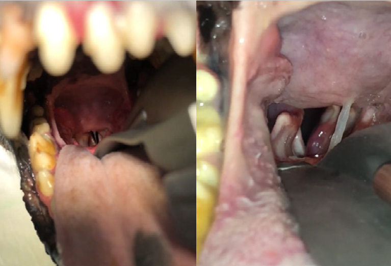 Los pacientes con parálisis laríngea pueden presentar desde una simple alteración en la fonación, toses, estridor laríngeo o intolerancia al ejercicio en su fase más inicial, hasta un distrés respiratorio, disnea, cianosis o síncope en etapas más crónicas (foto 1). Otros signos clínicos tales como hipertermia o neumonía por aspiración suelen aparecer como consecuencia de la complicación respiratoria1,3.