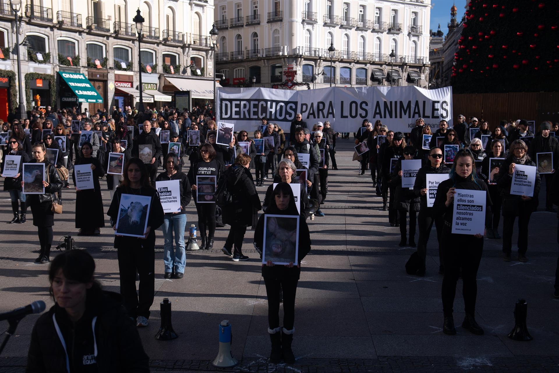 Cientos de activistas se han concentrado este sábado en la madrileña Puerta del Sol con motivo del Día Internacional de los Derechos Animales para denunciar las condiciones que padecen los animales en granjas y mataderos, así como para reclamar al Gobierno avances legislativos que refuercen su protección.