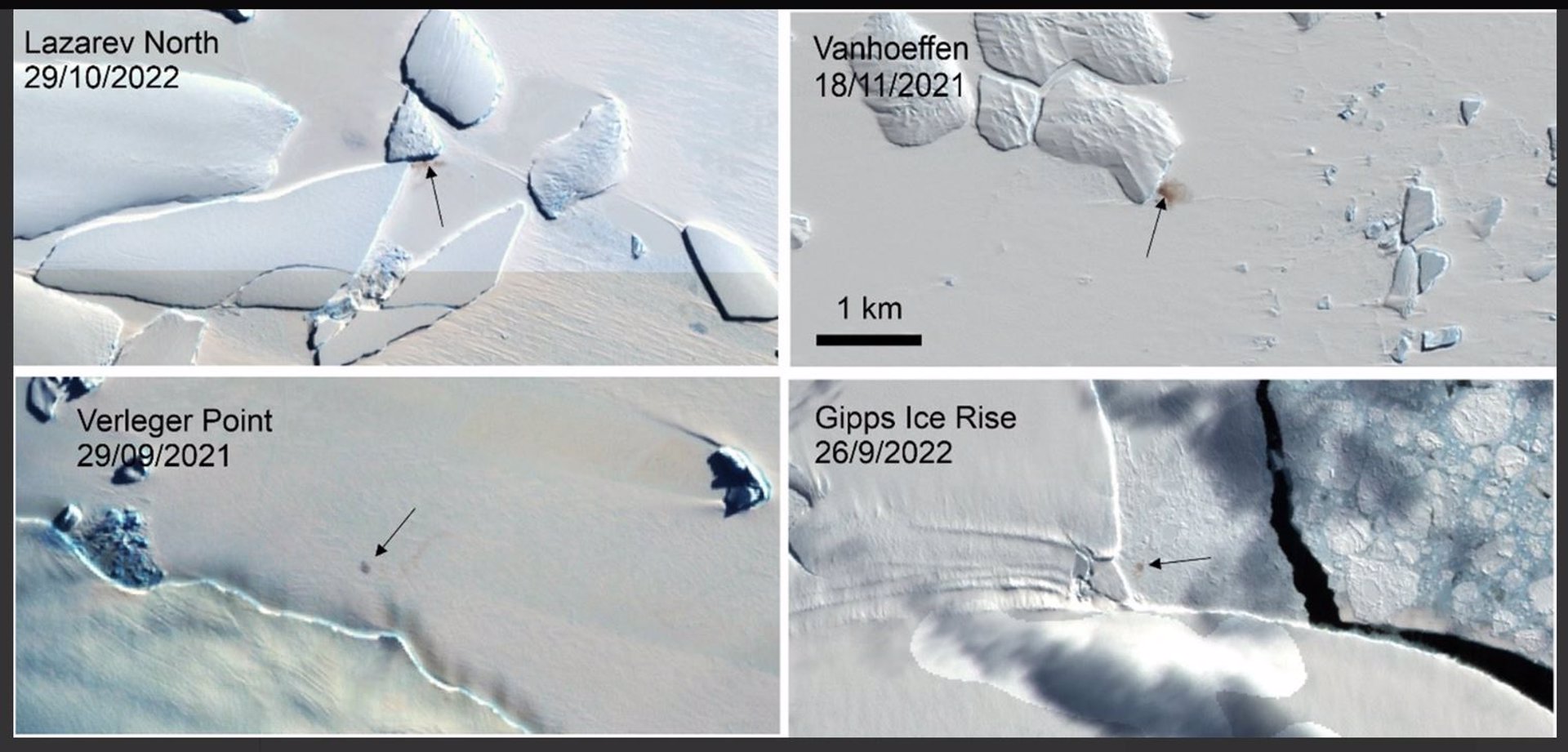 Los otros dos lugares, en Verleger Point y Vanhoeffen, parecen haber tenido una historia más permanente. Vanhoeffen probablemente no fue visto en búsquedas anteriores porque se encuentra a 30 kilómetros de la costa, sobre hielo fijo que se ha formado alrededor de viejos icebergs que quedaron atrapados en aguas poco profundas.