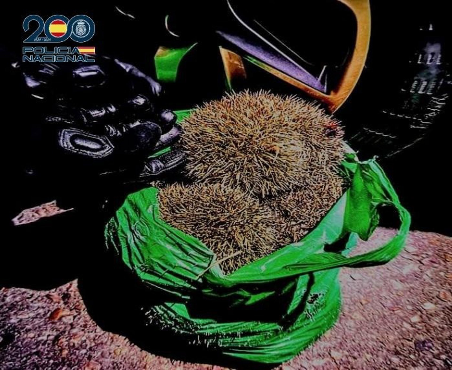 Los agentes le dieron el alto e identificaron a sus cuatro ocupantes, los cuales mostraban en todo momento una actitud evasiva y desafiante ante los agentes. En el registro del vehículo hallaron, en el suelo de la parte posterior, una bolsa de plástico con una decena de erizos con restos de sangre y un martillo, presumiblemente utilizado para golpear a los animales.