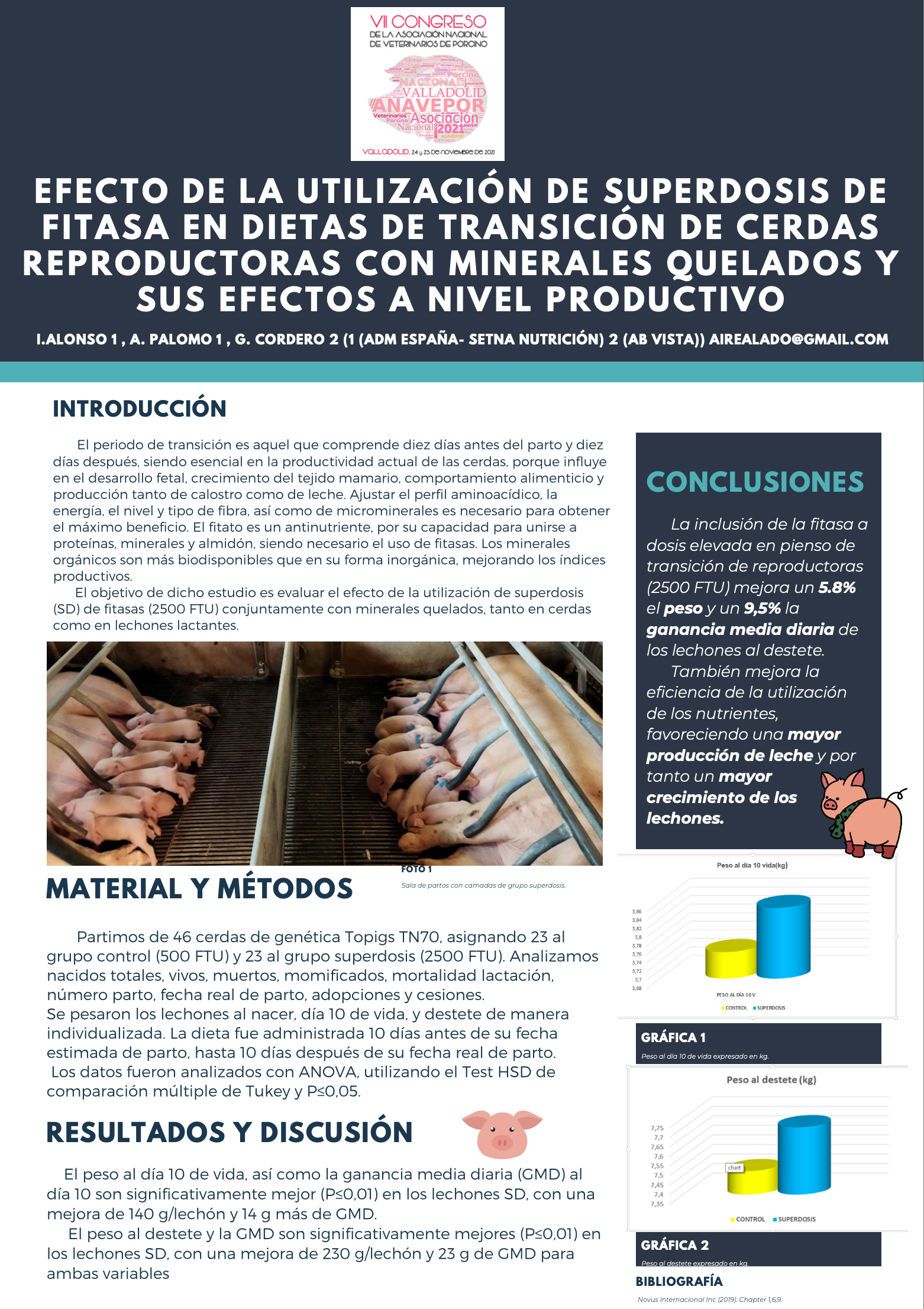 Partimos de 46 cerdas de genética Topigs TN70, asignando 23 algrupo control (500 FTU) y 23 al grupo superdosis (2500 FTU). Analizamosnacidos totales, vivos, muertos, momificados, mortalidad lactación,número parto, fecha real de parto, adopciones y cesiones.