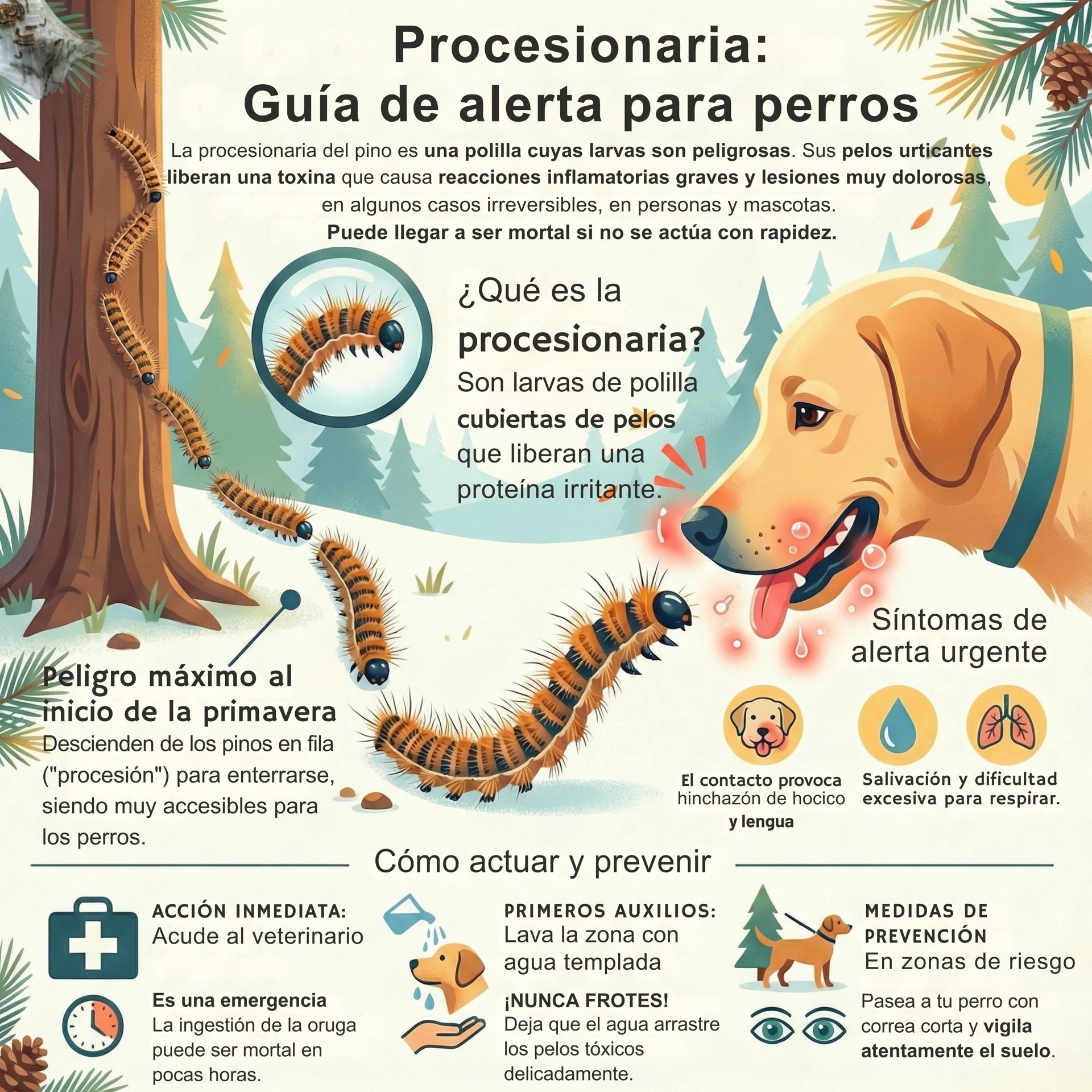 Por otro lado, como medidas de prevención en paseos (especialmente con viento), mejor hacerlo con correa corta en zonas de riesgo, vigilando el suelo y el entorno, sobre todo alrededor de pinos. Si se ven orugas no hay que tocarlas, ni apartarlas ni pisarlas.