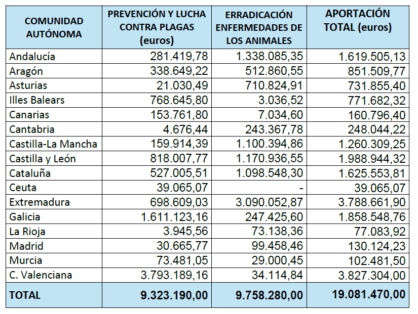 El Gobierno autoriza la distribución entre las comunidades autónomas de 19 millones de euros para programas de sanidad vegetal y animal