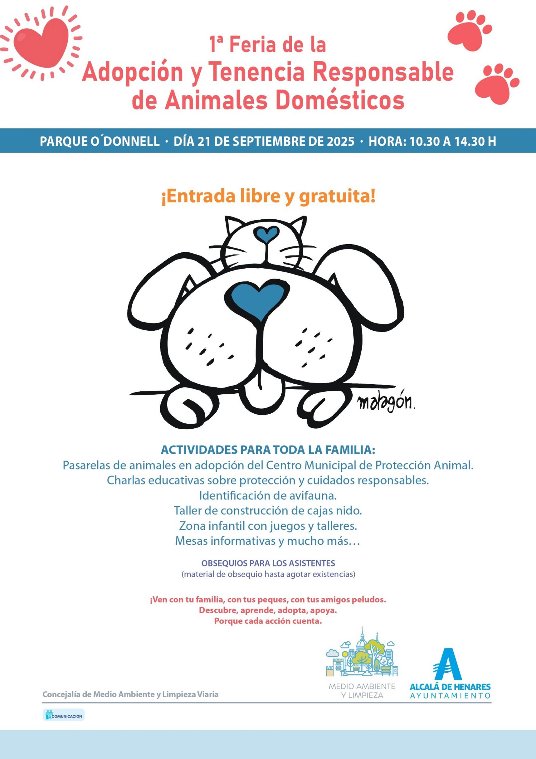 Los asistentes a la feria podrán llevarse a casa un obsequio, hasta agotar existencias, diseñado especialmente para compartir con sus mascotas, con ilustraciones originales creadas por el dibujante complutense José Malagón. Entre los obsequios se hará entrega de una botella reutilizable pensada para recordar, de forma creativa y responsable, la obligación de limpiar con agua las micciones de los perros en las vías y espacios públicos.