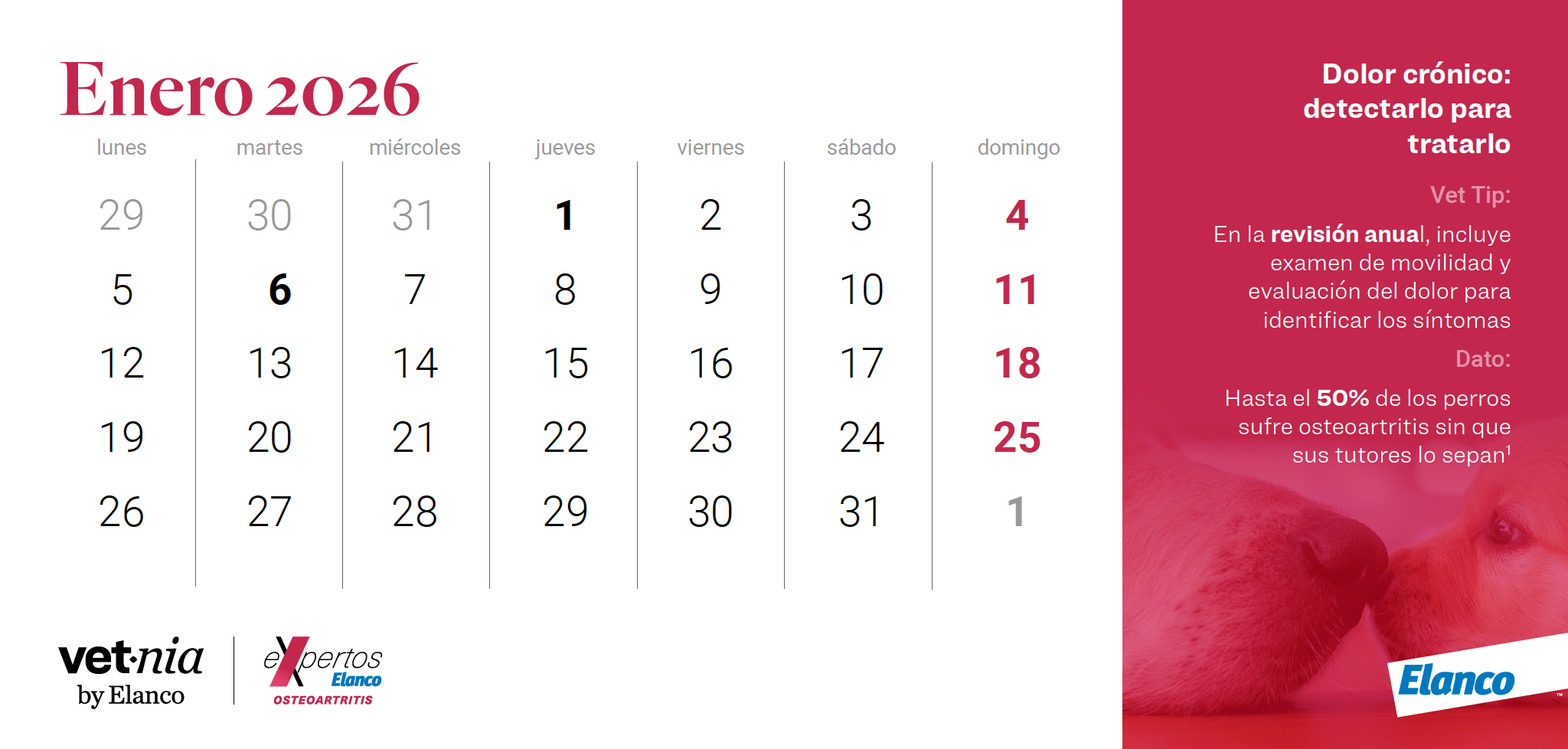 Bajo el lema “Innovación en Salud Animal. A tu lado cada día, todo el año”, el calendario refuerza el concepto eXpertos de Elanco, reflejando su compromiso con el desarrollo de productos y soluciones innovadoras basadas en la ciencia, diseñadas para dar respuesta a los retos reales de la práctica clínica veterinaria.