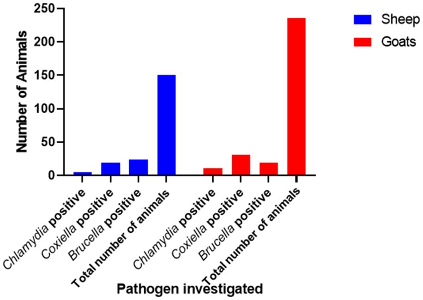 El análisis serológico reveló una prevalencia comparable de anticuerpos contra los tres agentes abortivos, C. burnetii, C. abortus y Brucella spp., en ovejas y cabras. No se encontraron diferencias significativas entre la prevalencia de estos patógenos en ovejas y cabras (Tabla 1).