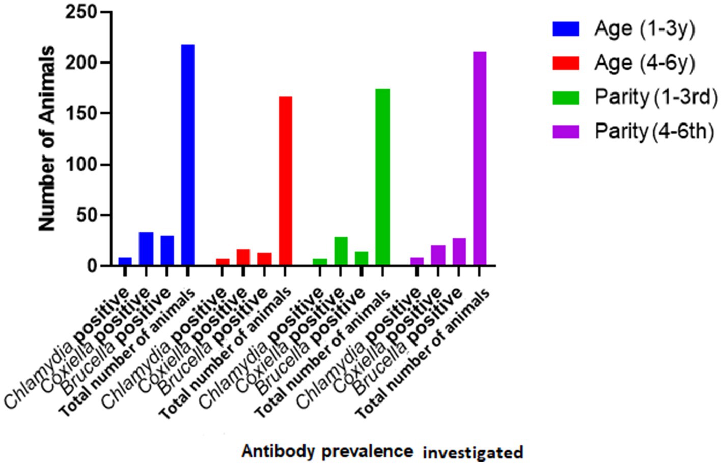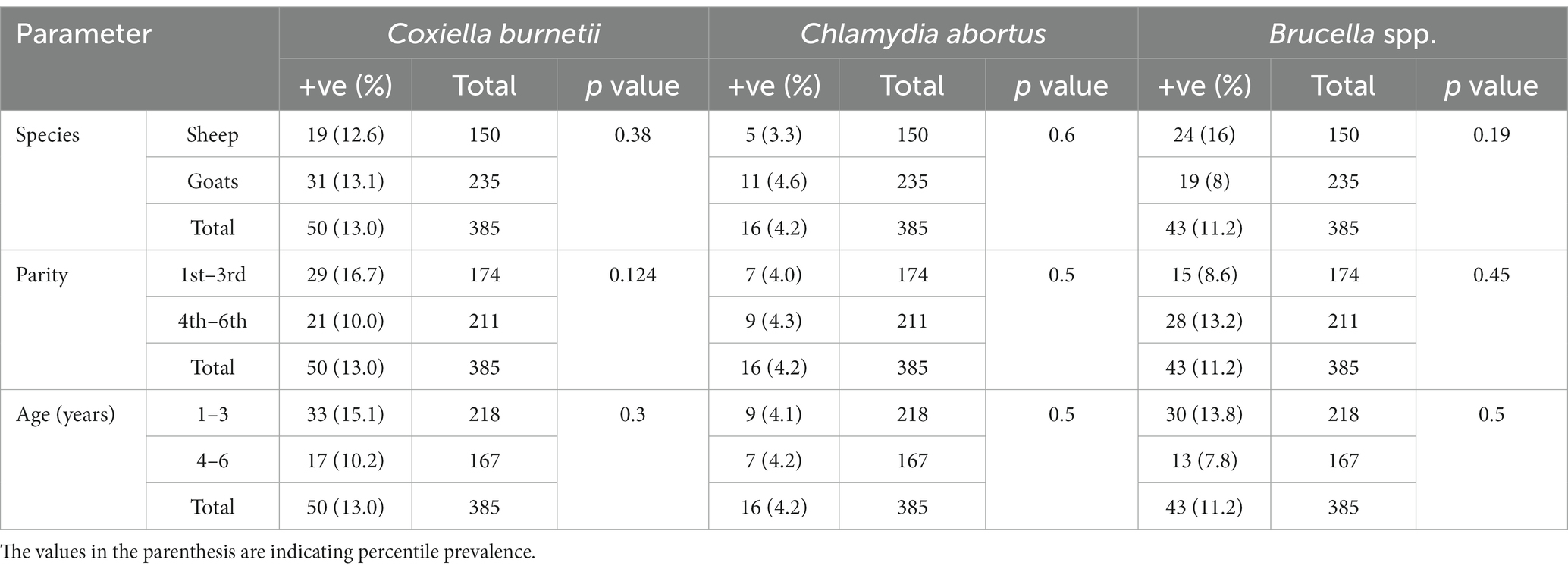 Nuestro estudio también estudió diferentes factores de riesgo para la infección con C. abortus, como la especie, la edad y las partes. Se registró una mayor seroprevalencia en cabras en comparación con las ovejas. Cinco de 150 ovejas (3,3%), mientras que 11 de 235 muestras caprinas dieron positivo (4,6%). Esta mayor prevalencia en cabras puede ser un sesgo de muestreo. Sin embargo, el análisis estadístico mostró que la especie huésped no es un factor de riesgo significativo (p > 0,05), como ya se describió en un estudio reciente (42). Aunque estadísticamente no siginifante (p > 0,05), sin embargo, se ha encontrado que los animales del grupo de edad de 1-3 años fueron encontrados positivos con mayor frecuencia que los del grupo de edad mayor de 3 años. Este hallazgo concuerda con los hallazgos de un estudio anterior (43). Las posibles razones de estos hallazgos ya se han descrito anteriormente.