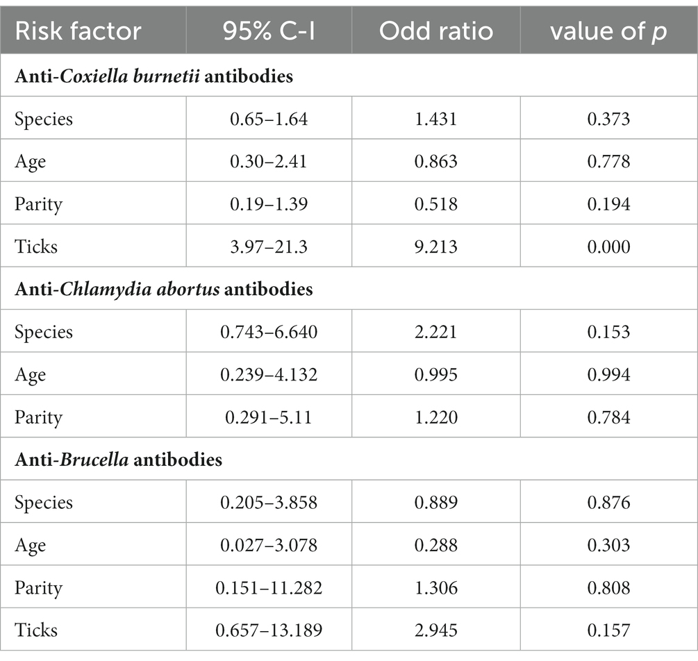 Se estudiaron las especies de animales (ovejas y cabras), la edad (dos grupos de edad: 1-3 años y 3-4 años) y la paridad como posibles factores de riesgo. El análisis estadístico (regresión logística binaria) reveló que la especie, la edad y la paridad no tienen un impacto significativo como factores de riesgo (Figura 2). Sin embargo, las garrapatas juegan un papel importante en la aparición de anticuerpos anti-C. burnetii. El análisis estadístico no mostró una relación significativa entre los anticuerpos anti-Brucella con las garrapatas. Los resultados se describen en la Tabla 2.