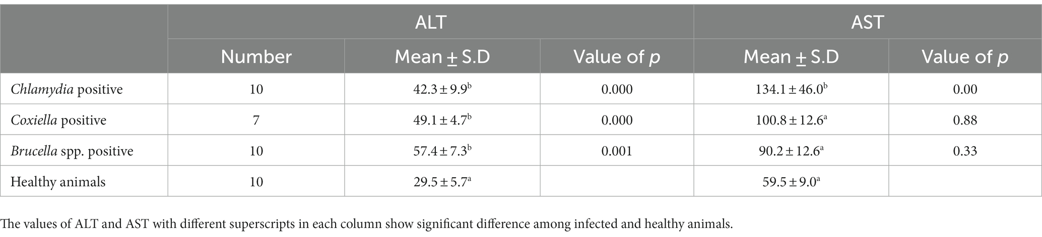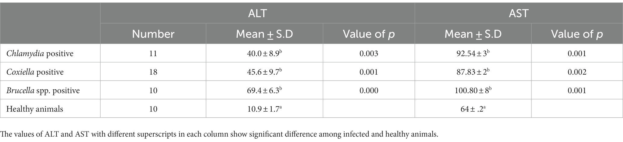 El análisis bioquímico indicó el aumento de la cantidad de las enzimas séricas ALT y AST. Esto puede deberse a la infección crónica, por ejemplo, inflamación continua del tejido placentario. La infección crónica del hígado por C. burnetii también es reportada por varios estudios. Esta infección crónica es responsable del aumento de ALT y AST y la disminución de la concentración total de proteínas en el suero. Nuestros resultados coinciden con los hallazgos de (39). También hay varios informes de hepatitis asociada con la infección por C. burnetii en humanos (40, 41).