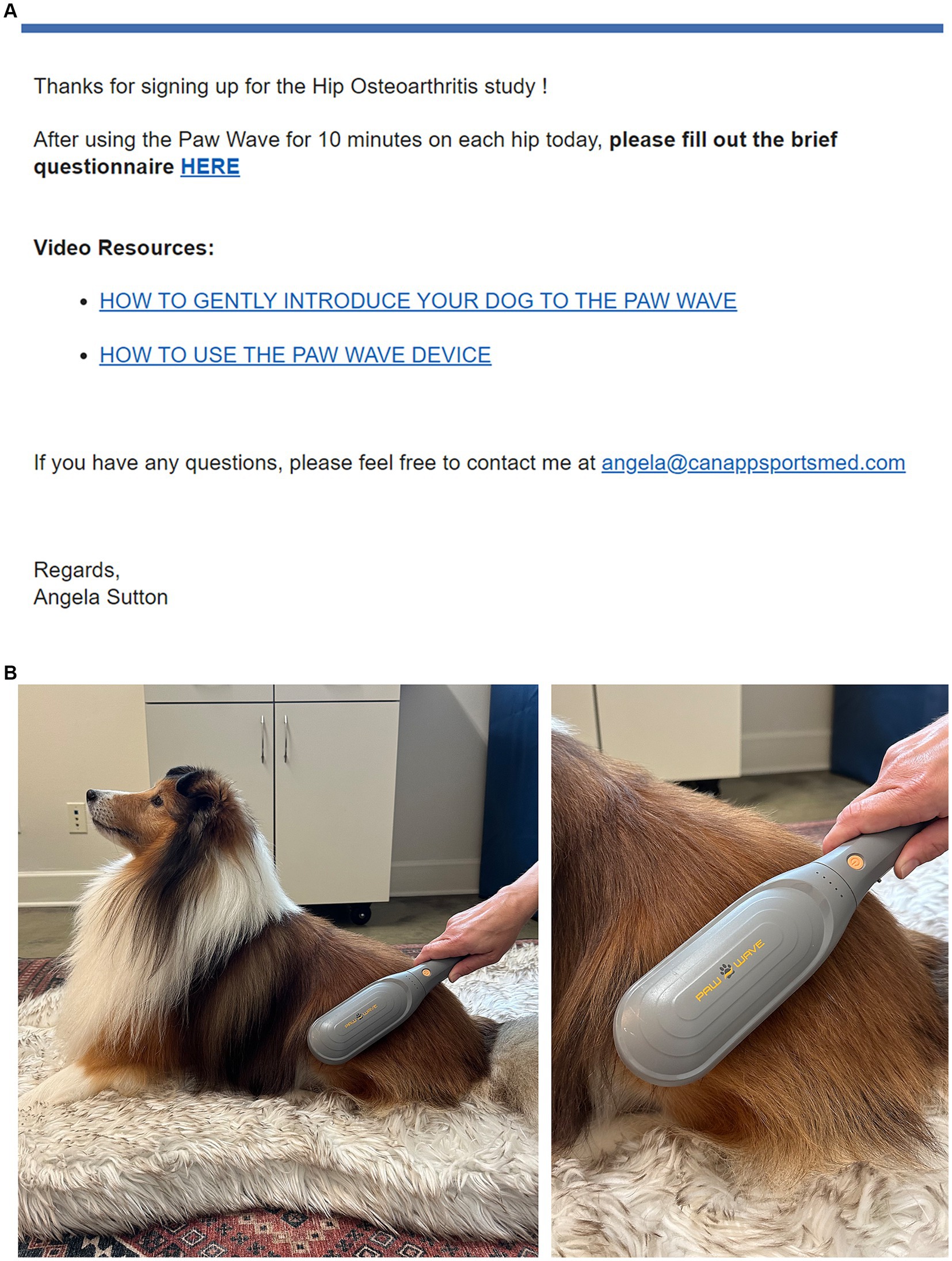 A los propietarios se les envió un dispositivo de vibración portátil disponible comercialmente (PawWave Buzz, Pado Inc., Valencia, CA 91355). Los propietarios recibieron instrucciones por escrito y se les pidió que vieran un recurso de video sobre el uso del dispositivo antes del inicio del estudio. Los propietarios recibieron correos electrónicos de recordatorio diarios durante el período de estudio (Figura 1A) y se les indicó que aplicaran el dispositivo de vibración de acuerdo con el video durante 10 minutos por cadera (Figura 1B), en la configuración más alta (frecuencia de 120 Hz, amplitud de 1 mm), diariamente durante un total de 14 días consecutivos durante el período de estudio.