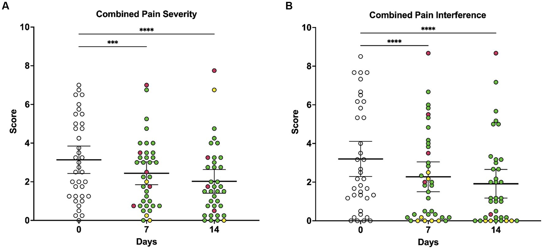 Figura 2. Puntuaciones de la gravedad del dolor compuesto CBPI y puntuaciones de interferencia del dolor compuesto informadas por el propietario al inicio, el día 7 y el día 14 de la terapia de vibración local. (A) Se les pidió a los propietarios que calificaran el nivel de dolor de su perro en una escala de 0 a 10 utilizando el CBPI, y se promediaron las puntuaciones de las cuatro preguntas sobre la gravedad del dolor para generar la puntuación de gravedad del dolor. Según lo evaluado por ANOVA de medidas repetidas, las puntuaciones medias de la gravedad del dolor disminuyeron significativamente con el tiempo (p < 0,0001) con múltiples pruebas de comparación que demostraron que las puntuaciones fueron más bajas a los 7 días (p = 0,0001) y a los 14 días (p < 0,0001) de tratamiento con el VI en comparación con el valor basal. (B) Se les pidió a los propietarios que calificaran cómo el dolor había interferido con la capacidad de su perro para realizar diferentes actividades en una escala de 0 a 10 utilizando el CBPI, y se promediaron las puntuaciones de las seis preguntas sobre la interferencia del dolor para generar la puntuación de interferencia del dolor. Según lo evaluado por ANOVA de medidas repetidas, las puntuaciones medias de interferencia del dolor disminuyeron significativamente con el tiempo (p < 0,0001), y las pruebas de comparación múltiple revelaron que las puntuaciones fueron más bajas a los 7 días (p < 0,0001) y a los 14 días (p < 0,0001) de la terapia de vibración en comparación con el valor basal. Para todas las comparaciones, el nivel de significación es alfa = 0,05. Para las pruebas de comparaciones múltiples, la significación se indica con asteriscos: *p < 0,05, **p < 0,01, p < 0,001 y p < 0,0001. Cada punto representa las puntuaciones de los perros individuales en el estudio a lo largo del tiempo; Los colores representan el cambio en la puntuación en comparación con el valor basal (día 0), siendo el verde el que indica una disminución de la puntuación, el amarillo que indica que no hay cambios en la puntuación y el rojo que indica un aumento de la puntuación. Cada gráfico también indica la media y el intervalo de confianza del 95%.
