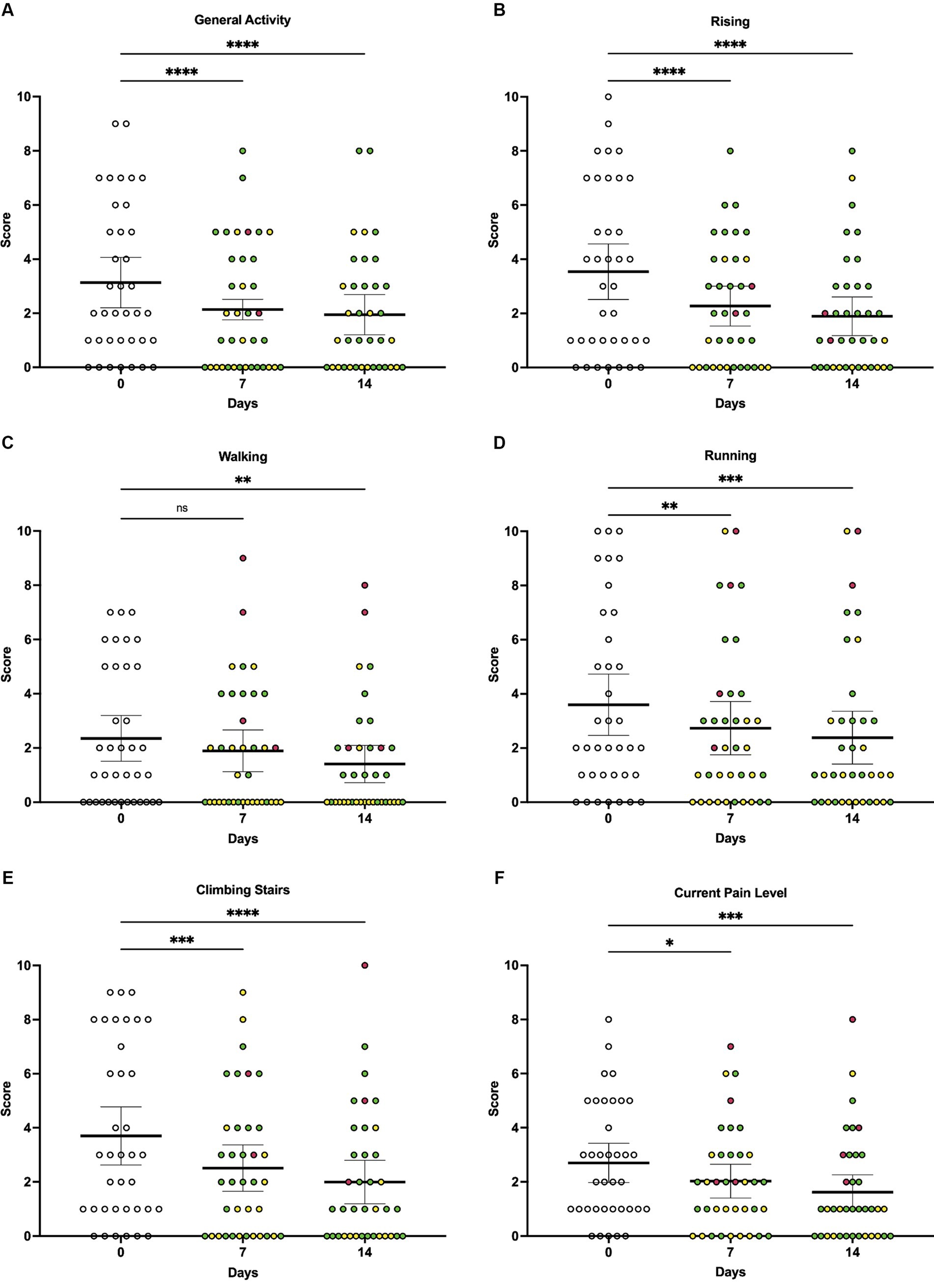 Figura 3. Puntuaciones CBPI informadas por el propietario individual al inicio, el día 7 y el día 14 de la terapia de vibración local. Si bien el CBPI no está validado para el uso de puntuaciones individuales para evaluar directamente la respuesta al tratamiento, aquí informamos un subconjunto de puntuaciones individuales del CBPI para demostrar que las disminuciones significativas observadas en las puntuaciones compuestas fueron impulsadas por disminuciones en múltiples componentes del cuestionario. Para cada parámetro, el cambio en las puntuaciones de los animales individuales a lo largo del tiempo se evaluó mediante ANOVA de medidas repetidas, con las pruebas de comparaciones múltiples de Dunnett utilizadas para comparar las puntuaciones entre el inicio (día 0) y el día 7 o el día 14, respectivamente. (A) Las puntuaciones medias asociadas con la actividad general disminuyeron significativamente con el tiempo (p < 0,0001), con pruebas de comparación múltiple que mostraron disminuciones significativas en las puntuaciones en el día 7 (p < 0,0001) y el día 14 (p < 0,0001) en comparación con la línea de base. (B) Las puntuaciones medias asociadas con el aumento disminuyeron significativamente con el tiempo (p < 0,0001), con pruebas de comparación múltiple que mostraron disminuciones significativas en las puntuaciones en el día 7 (p < 0,0001) y el día 14 (p < 0,0001) en comparación con la línea de base. (C) Las puntuaciones medias asociadas a la marcha disminuyeron significativamente con el tiempo (p = 0,0019); Mientras que las pruebas de comparación múltiple no mostraron diferencias significativas en las puntuaciones al día 7 en comparación con el valor basal (p = 0,0813), se observó una diferencia significativa en el día 14 en comparación con el valor basal (p = 0,0036). (D) Las puntuaciones medias asociadas a correr disminuyeron significativamente con el tiempo (p < 0,0001), con pruebas de comparaciones múltiples que mostraron disminuciones significativas en las puntuaciones en el día 7 (p = 0,0016) y el día 14 (p = 0,0002) en comparación con la línea de base. (E) Las puntuaciones medias asociadas a subir escaleras disminuyeron significativamente con el tiempo (p < 0,0001), con pruebas de comparaciones múltiples que mostraron disminuciones significativas en las puntuaciones en el día 7 (p = 0,0008) y el día 14 (p < 0,0001) en comparación con la línea de base. (F) Las puntuaciones medias asociadas con la evaluación del propietario del nivel de dolor actual de su perro disminuyeron significativamente con el tiempo (p = 0,0003), con múltiples pruebas de comparación que mostraron disminuciones significativas en el nivel actual percibido de dolor en el día 7 (p = 0,0131) y el día 14 (p = 0,0007) en comparación con la línea de base. Para todas las comparaciones, el nivel de significación se estableció en alfa = 0,05. Para las pruebas de comparaciones múltiples, la significación se indica con asteriscos: *p < 0,05, **p < 0,01, p < 0,001 y p < 0,0001. Cada punto representa las puntuaciones de los perros individuales en el estudio a lo largo del tiempo; Los colores representan el cambio en la puntuación en comparación con el valor basal (día 0), siendo el verde el que indica una disminución de la puntuación, el amarillo que indica que no hay cambios en la puntuación y el rojo que indica un aumento de la puntuación. Cada gráfico también indica la media y el intervalo de confianza del 95%.