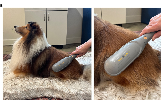 A los propietarios se les envió un dispositivo de vibración portátil disponible comercialmente (PawWave Buzz, Pado Inc., Valencia, CA 91355). Los propietarios recibieron instrucciones por escrito y se les pidió que vieran un recurso de video sobre el uso del dispositivo antes del inicio del estudio. Los propietarios recibieron correos electrónicos de recordatorio diarios durante el período de estudio (Figura 1A) y se les indicó que aplicaran el dispositivo de vibración de acuerdo con el video durante 10 minutos por cadera (Figura 1B), en la configuración más alta (frecuencia de 120 Hz, amplitud de 1 mm), diariamente durante un total de 14 días consecutivos durante el período de estudio.