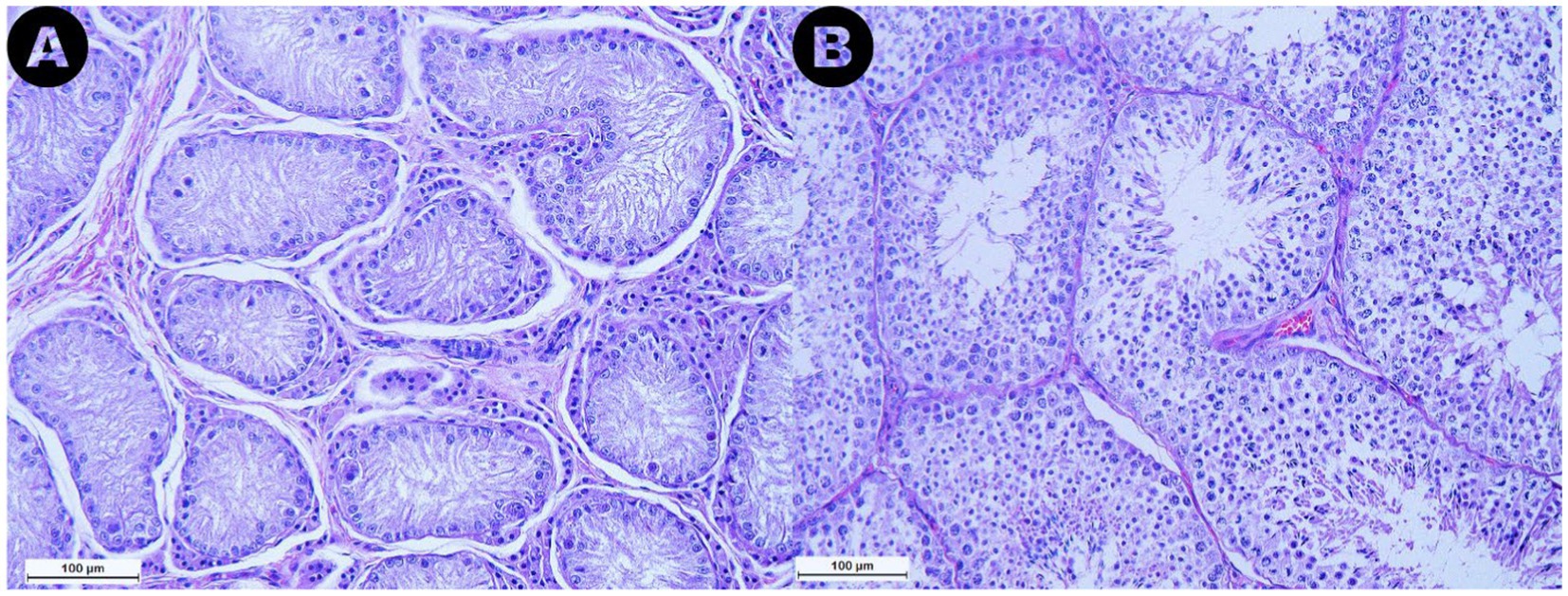 Las muestras analizadas de la categoría RET exhibieron túbulos seminíferos con pocas células germinales, con el 76,7% de las secciones de túbulos evaluadas clasificadas como túbulos solo de células de Sertoli. Además, se observó una marcada reducción o ausencia de la luz (Figura 4A). Además, se evidenció la degeneración seminífero de los túbulos, caracterizada por una pérdida general de los detalles celulares. La membrana basal que rodea los túbulos parecía engrosada en comparación con las muestras de los grupos CONTRA y DES. Además, en el espacio intersticial de los testículos RET, se observó subjetivamente un aumento en el número de células de Leydig, acompañado de una mayor cantidad de tejido conectivo (Figura 4A), en comparación con las muestras de DES (Figura 4B).