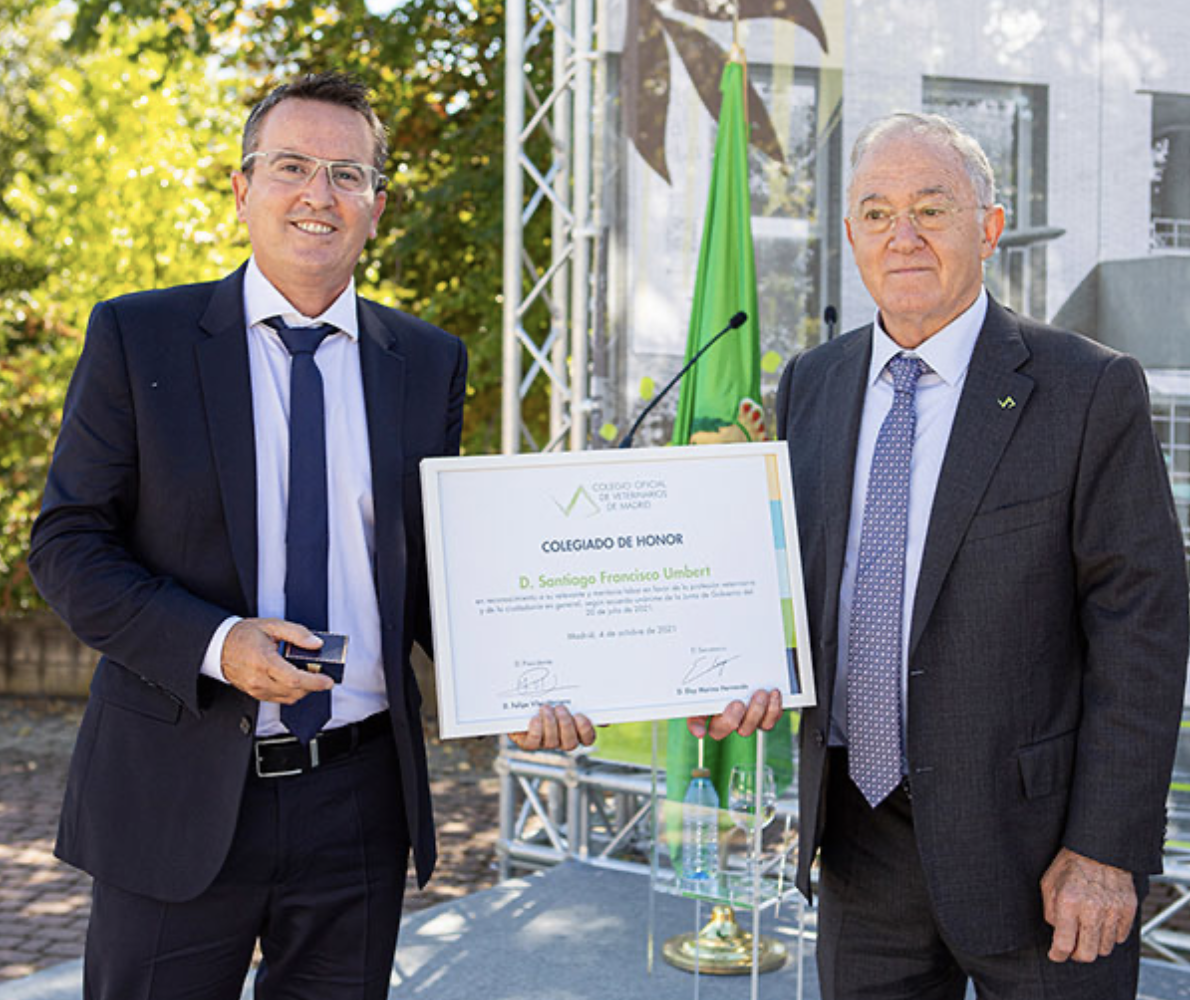 Seguidamente, Santiago Francisco Umbert, fue nombrado Colegiado de Honor no veterinario, según explicó el presidente, ‘por su entrega y generosidad en los momentos críticos de la pandemia, participando en un grupo de voluntarios que acondicionaron equipos de ventilación veterinarios para su utilización en humanos y que ayudaron a salvar vidas’. ‘Llevo 30 años aprendiendo de los veterinarios y todo lo que sé de equipos y de anestesia lo he aprendido de los clínicos por lo que agradezco mucho el reconocimiento al colectivo veterinario’, dijo tras recibir su reconocimiento.