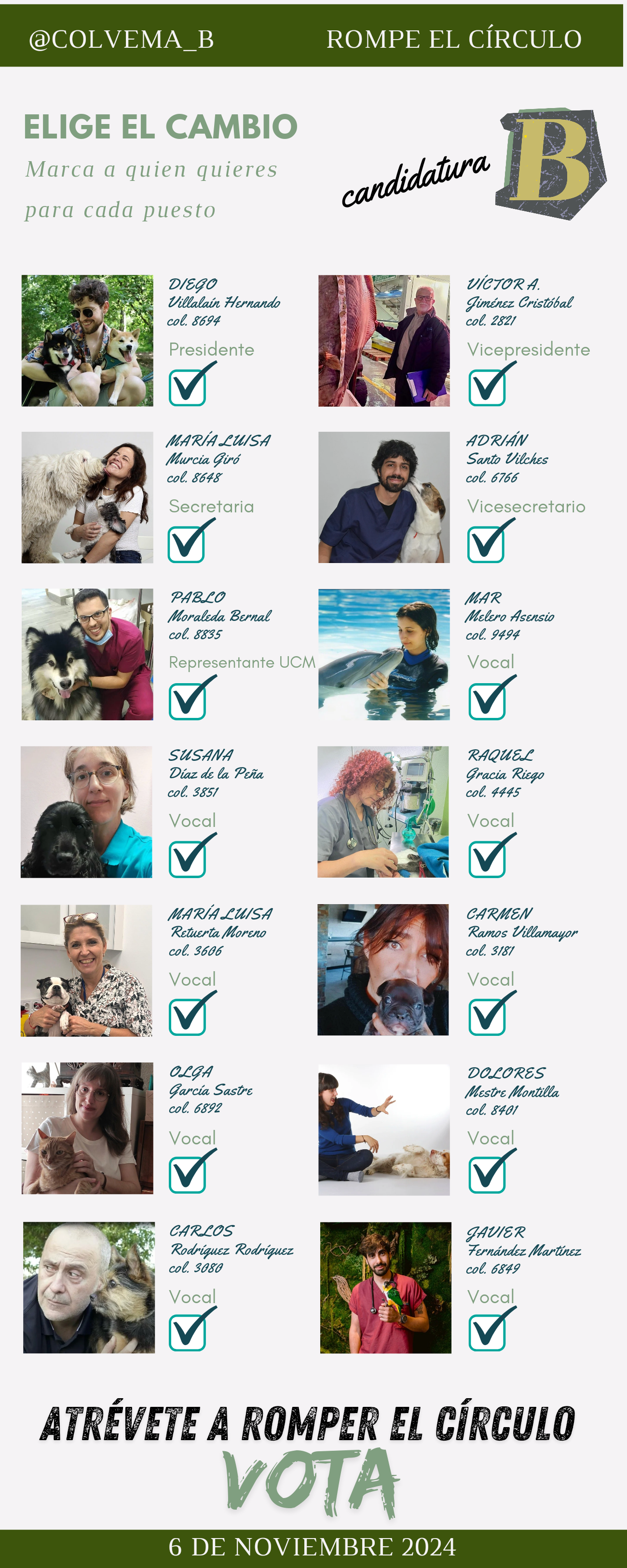 Un equipo sólido de 14 profesionales veterinarios que han desarrollado sus carreras en diferentes ramas del sector y con experiencia en gestión tanto pública como privada. Una candidatura formada por empleados, empleadores, técnicos superiores, funcionarios y veterinarios clínicos que conocen de primera mano la realidad de la profesión comprometidos con defender a los colegiados, sea cual sea su actividad profesional.