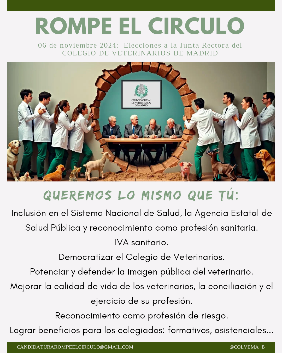 El próximo 6 de noviembre se celebran las elecciones a la Junta de Gobierno del Colegio Oficial de Veterinarios de Madrid a la que se presentan dos candidaturas: la Junta actual, que lleva más de 20 años al cargo, y la candidatura “Rompe el círculo”, la primera propuesta alternativa en la últimas dos décadas