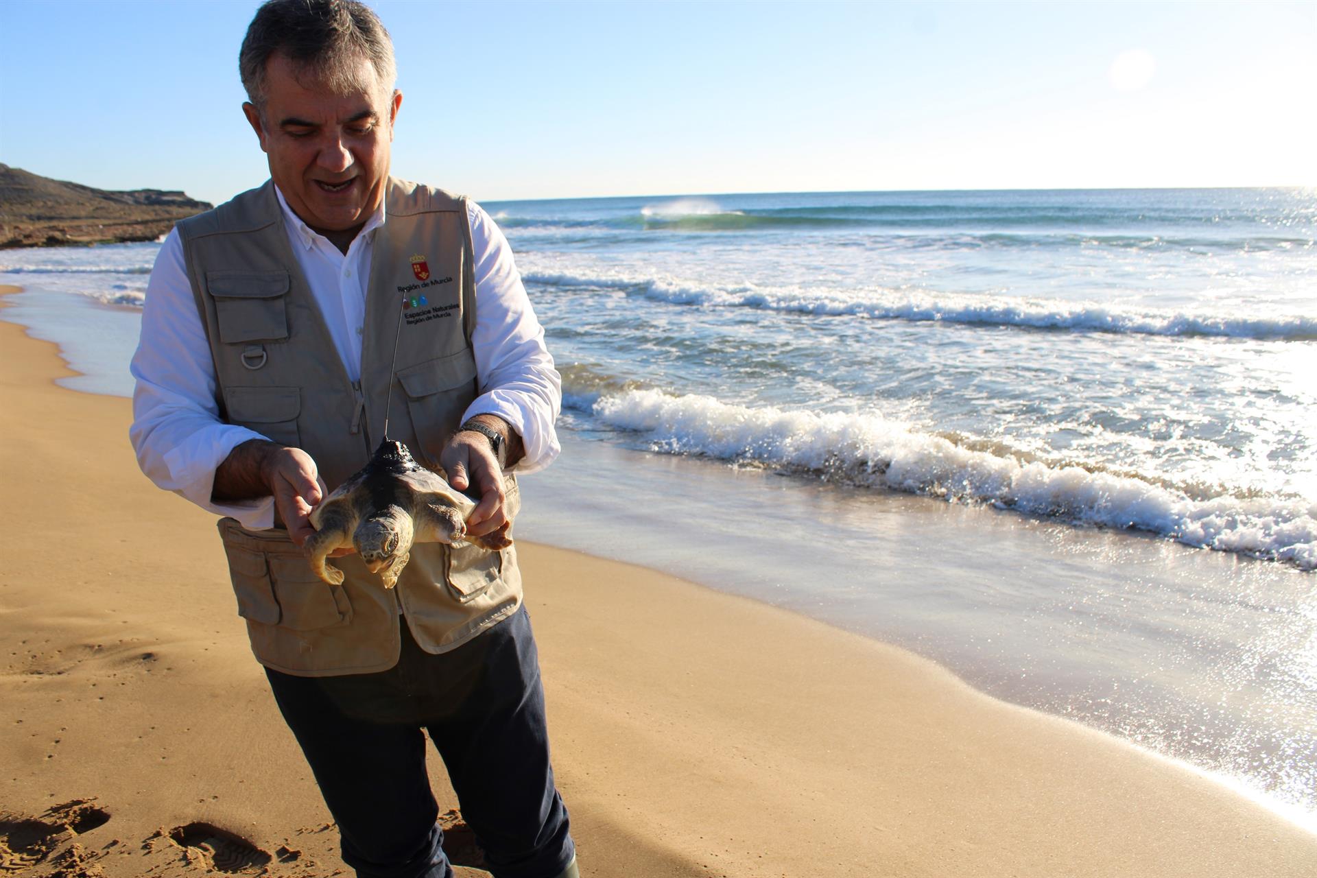 La Comunidad Autónoma ha batido el récord en 2023 en el número de liberaciones de tortuga boba (Caretta caretta) de los últimos cinco años. El consejero de Medio Ambiente, Universidades, Investigación y Mar Menor, Juan María Vázquez, ha liberado este martes en la playa de Calblanque la sexta tortuga boba del presente año, convirtiéndose el 2023 en el que más ejemplares se han soltado, dado que entre 2019 y 2022 fueron cinco.