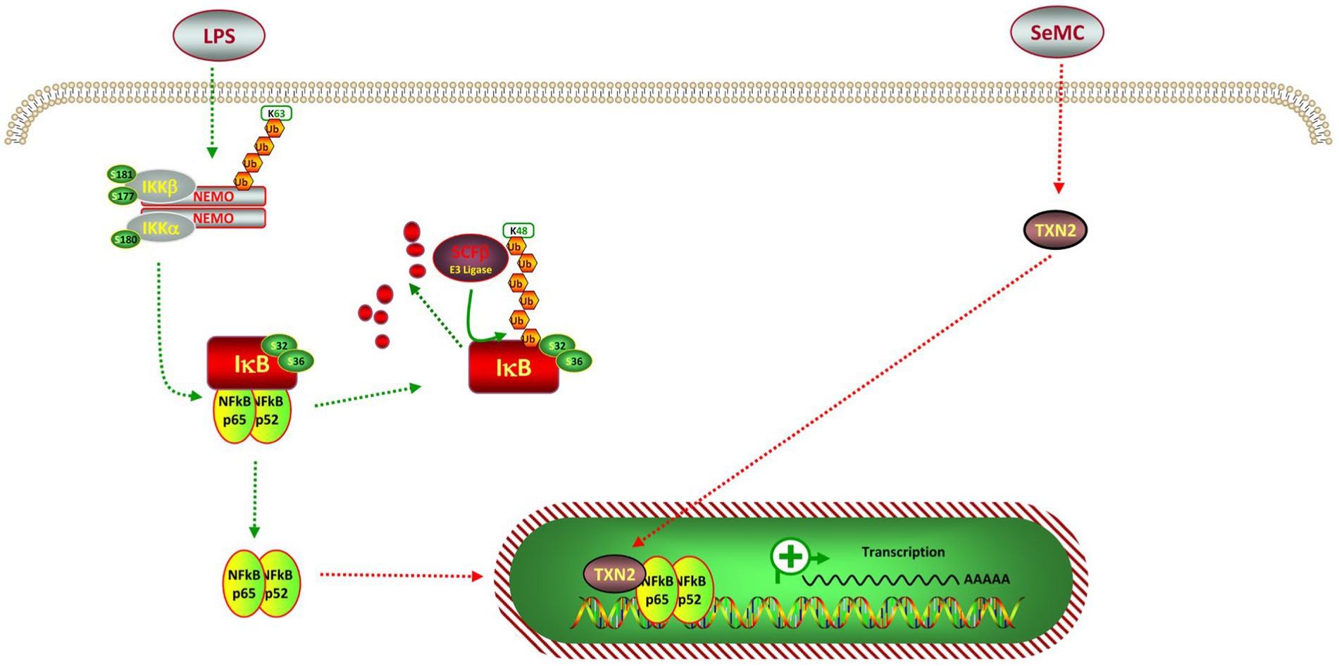 Entre las diversas fuentes de suplementos de selenio, la Se-metilselenocisteína (SeMC) es un compuesto orgánico natural de selenio que ha demostrado tener múltiples ventajas en términos de eficiencia metabólica y bioseguridad en animales. Sin embargo, el impacto de SeMC en todo el genoma en la transcripción de genes aún no se ha dilucidado. En este estudio, empleamos un modelo de células similares a macrófagos HD11 de pollo estimulado por LPS para identificar los principales factores de transcripción involucrados en la regulación del transcriptoma responsables del tratamiento con SeMC. RNA-seq identificó 3.263 transcripciones que exhibieron una expresión diferencial estadísticamente significativa entre el grupo tratado con SeMC y el grupo de control y 1.344 transcripciones que exhibieron una expresión diferencial estadísticamente significativa entre los grupos tratados con LPS + SeMC y LPS (FDR < 0.05, FDR > 1.5). El análisis bioinformático identificó seis factores de transcripción (NFKB2, RFX2, E2F5, ETV5, BACH1 y E2F7) como posibles genes candidatos para la regulación del transcriptoma en células HD11 tratadas con SeMC. La verificación experimental posterior demostró que SeMC suprimió la respuesta inflamatoria en un modelo de células HD11 de pollo estimuladas con LPS a través de la vía TXN2-NF-κB. Se observó que la administración de SeMC reduce la producción de ROS, así como la transcripción y traducción de citocinas inflamatorias tanto en cultivos celulares como en estudios in vivo con animales. Una vía candidata por la que SeMC ejerce sus efectos es a través de la focalización del factor de transcripción, NFKB2, por la selenoproteína TXN2. Este estudio identificó factores clave de transcripción y reveló uno de los posibles mecanismos a través de los cuales SeMC ejerce sus efectos antiinflamatorios desde la perspectiva de la regulación transcripcional.