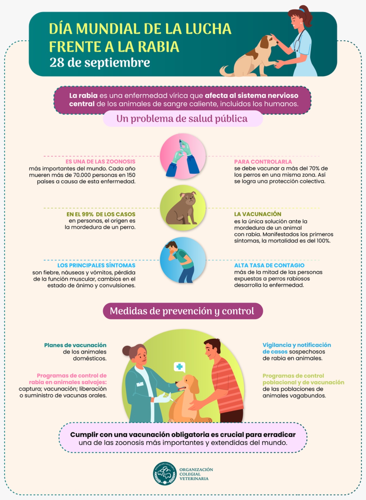 Así lo explica la Organización Colegial Veterinaria (OCV) con motivo del Día Mundial de la Lucha contra la Rabia, que se celebra cada 28 de septiembre. Son los perros los que transmiten, a través de la mordedura o arañazos, el 99% de los casos en personas, “y la única forma de prevenir la rabia es mediante la identificación de los animales vacunados, la revacunación obligatoria anual y el registro de estas acciones para su trazabilidad y control por parte de las autoridades”.