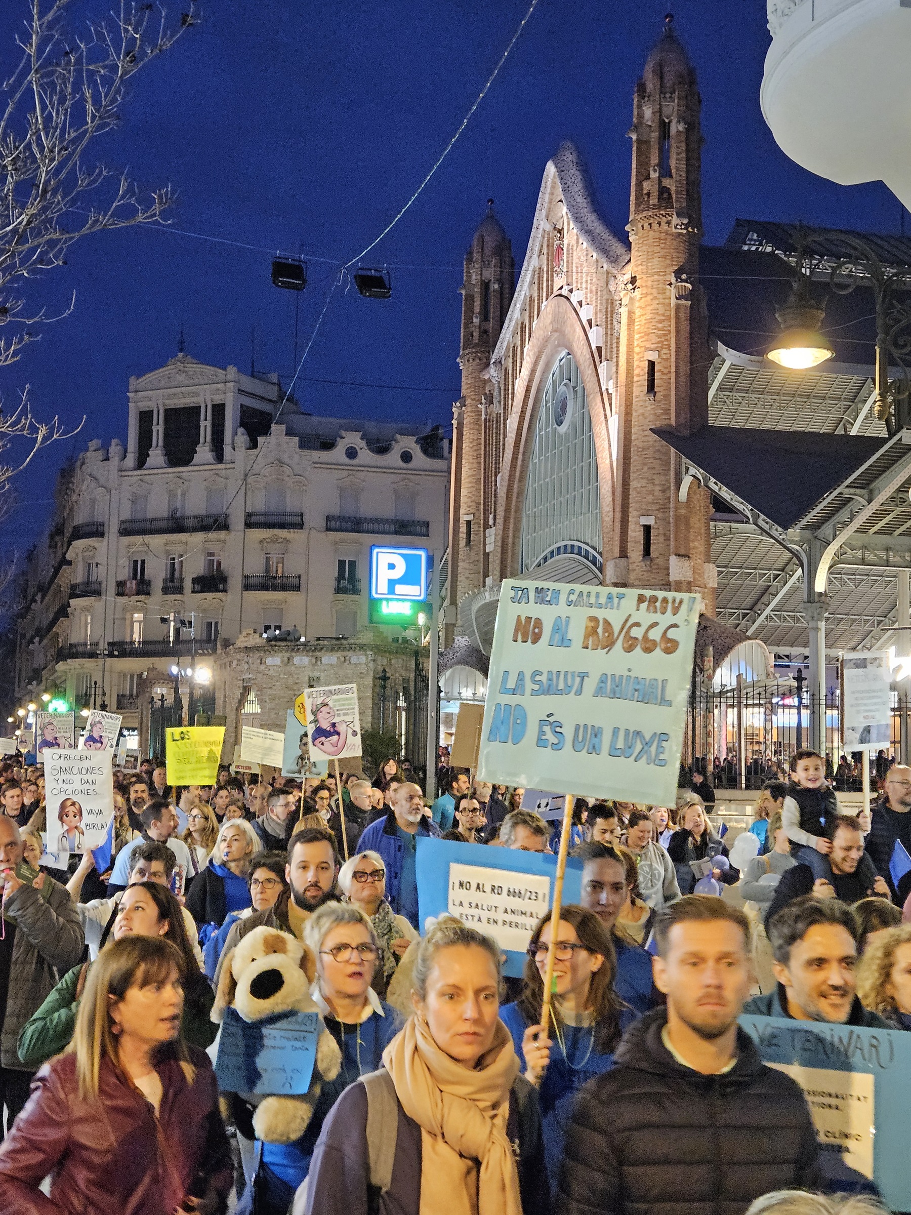La manifestación ha arrancado, con algo de retraso, en torno a las 18 horas desde la sede de la Dirección General de Salud Pública (Av. de Catalunya, 21, Benimaclet) y, tras recorrer el centro de la ciudad, ha llegado a la Plaza del Ayuntamiento de Valencia en torno a las 19:40 horas. Ésta es ya la tercera movilización que se organiza en protesta contra el actual marco regulatorio del medicamento. Anteriormente, en Barcelona, ya se realizó una manifestación y el pasado 11 de febrero en buena parte del país pero en la práctica totalidad de centros veterinarios de la Comunidad Valenciana se realizó un cierre a partir de las 11 de la mañana. Y no serán las últimas: el próximo día 28 frente a IFEMA (Feria Madrid), coincidiendo con la clausura del Congreso Iberzoo Propet se realizará otra gran concentración y el 5 de marzo, frente a la sede del Ministerio de Agricultura, responsable del sistema PRESVET que tanto malestar está generando, se quiere cerrar el calendario de movilizaciones.