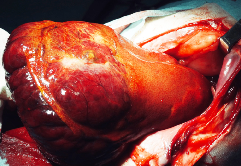 Se realizó el diagnóstico mediante ecografía, con toma de biopsia con aguja trucut. En un estudio de 48 perros, los que sobrevivieron al postoperatorio un 95,2%, presentaron un tiempo de supervivencia 15,4 veces mayor al grupo de perros tratados médicamente9. Los perros que presentaban un tumor en el lado izquierdo, como en nuestro caso, presentaban una supervivencia mayor con el tratamiento quirúrgico. La ecografía es una técnica más específica, nos permite detectar cambios anatómicos y focales. La resonancia magnética y el TAC, nos permiten obtener una imagen en 3D reconstruyendo la vascularización hepática7,16 y una localización exacta de la masa incluyendo los márgenes tumorales. (Imagen 1)