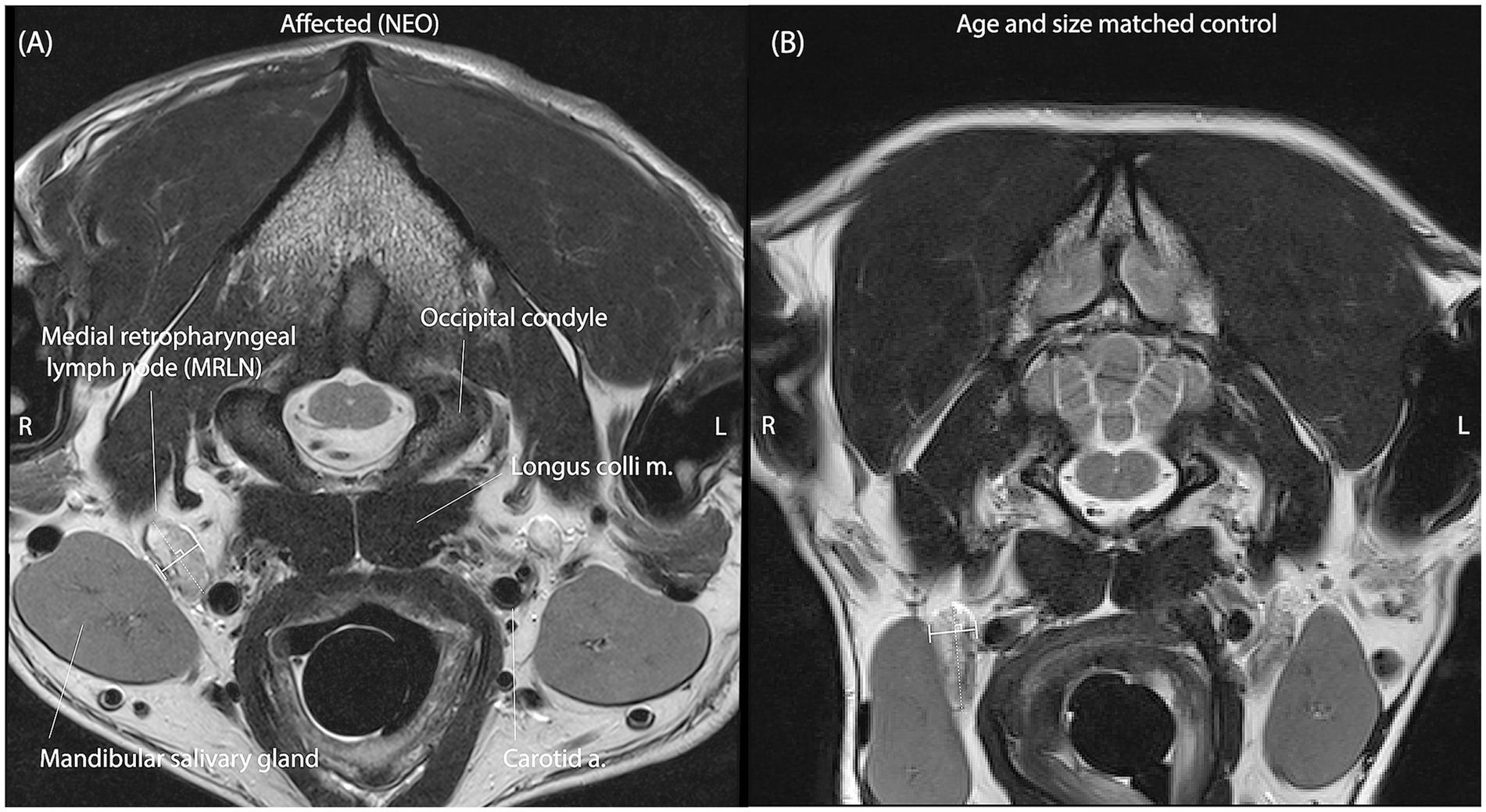 Introducción: El objetivo de este estudio es estimar los valores de referencia para los ganglios linfáticos retrofaríngeos mediales (MRLN) medidos en estudios de resonancia magnética de alto campo (3T) de la cabeza/cerebro canino utilizando imágenes de espín-eco T2 transversal y determinar si los perros con enfermedad cerebral estructural exhiben ganglios linfáticos retrofaríngeos mediales que son más grandes de lo esperado a partir de los valores de referencia estimados.