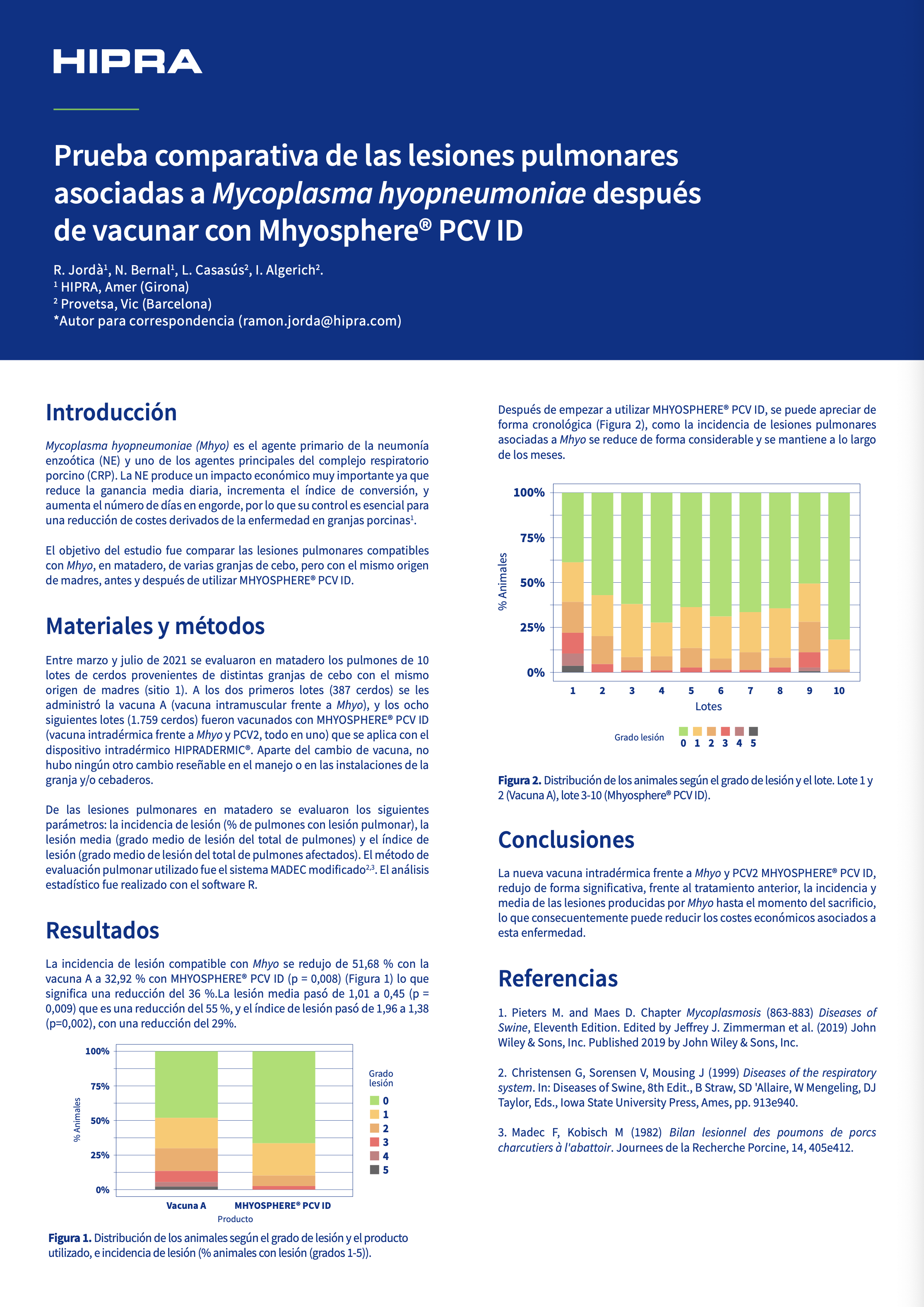 Entre marzo y julio de 2021 se evaluaron en matadero los pulmones de 10 lotes de cerdos provenientes de distintas granjas de cebo con el mismo origen de madres (sitio 1). A los dos primeros lotes (387 cerdos) se les administró la vacuna A (vacuna intramuscular frente a Mhyo), y los ocho siguientes lotes (1.759 cerdos) fueron vacunados con MHYOSPHERE® PCV ID (vacuna intradérmica frente a Mhyo y PCV2, todo en uno) que se aplica con el dispositivo intradérmico HIPRADERMIC®. Aparte del cambio de vacuna, no hubo ningún otro cambio reseñable en el manejo o en las instalaciones de la granja y/o cebaderos.
