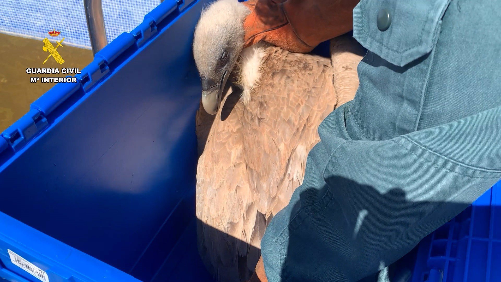 Agentes del Seprona de la Guardia Civil han rescatado a un buitre leonado adulto (Gyps fulvus) que había quedado atrapado en el interior de una piscina vacía en una zona rural del término municipal alicantino de Ibi, según ha informado el Instituto Armado.