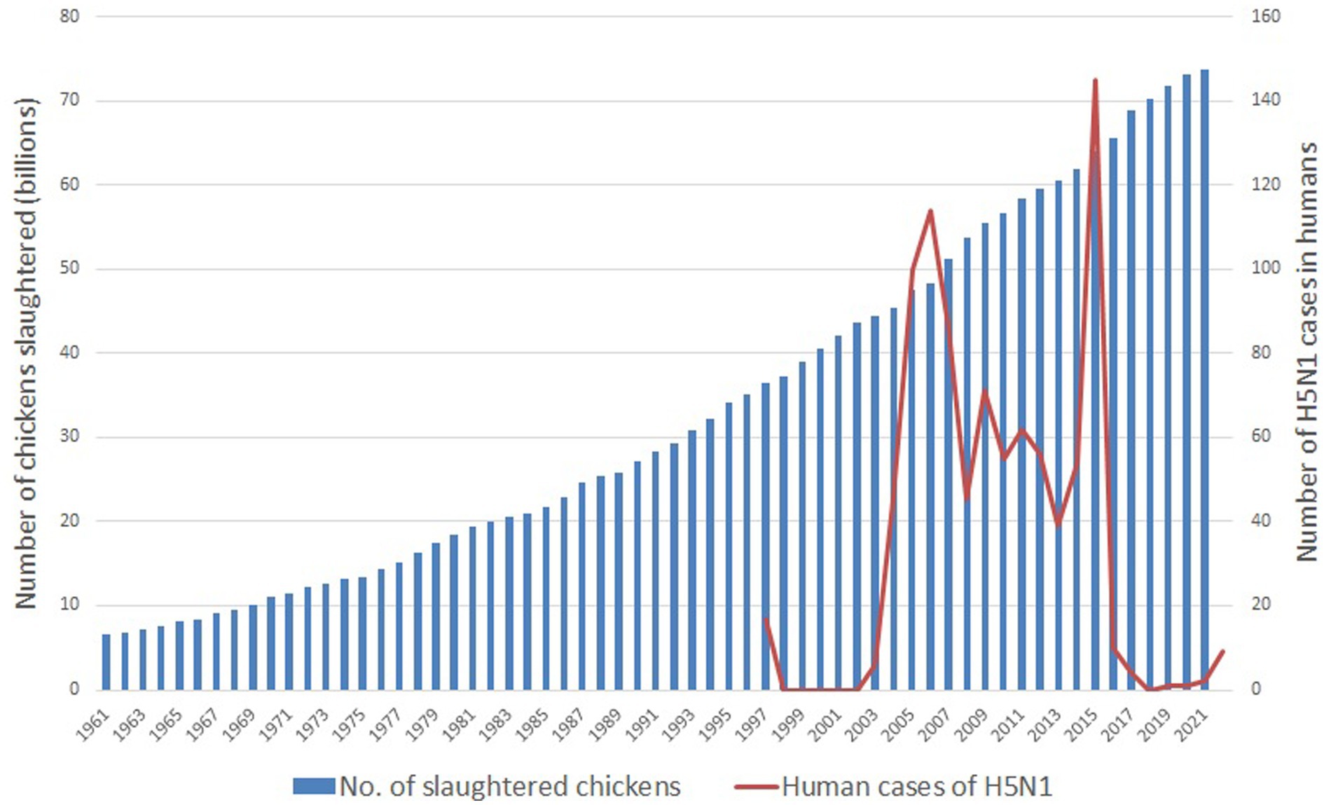Figura 2. Número mundial de pollos de granja sacrificados y casos mundiales de H5N1 en humanos entre 1961 y 2022. En 2017 se introdujo una vacuna H5 [(17), pág. 5]. Los datos de casos de H5N1 provienen de los CDC (40) y los registros comienzan en 1997; El número de pollos sacrificados procede de la FAO de las Naciones Unidas (38). Según Kessler et al. (17).