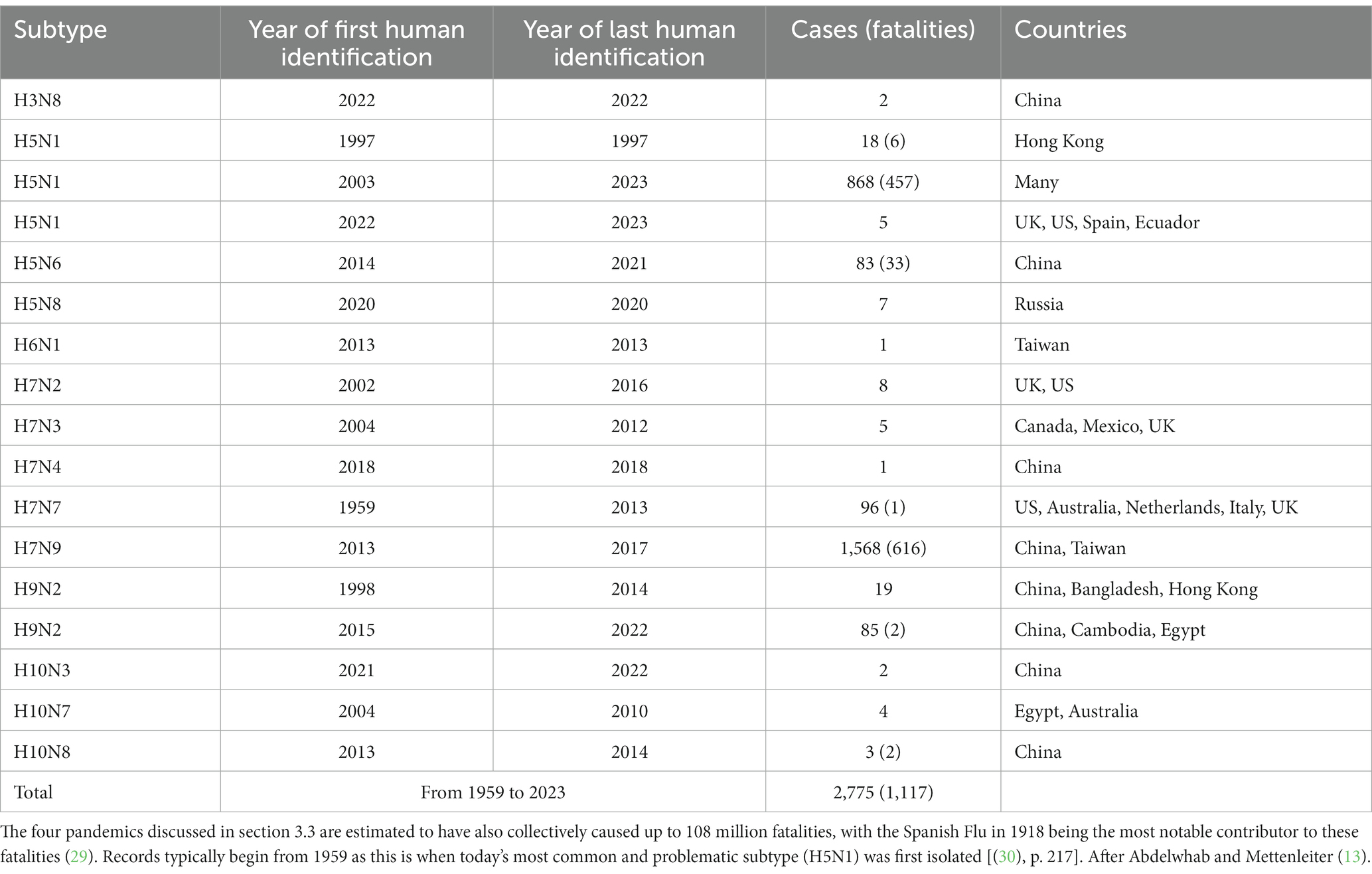 En la Tabla 3 se notifican otros casos zoonóticos (que no alcanzaron el nivel pandémico, es decir, generalizados a nivel nacional o internacional) de virus de la influenza aviar en humanos entre 1959 y 2023. Tomando los dos subtipos con el mayor número de casos, H5N1 y H7N9, las tasas de mortalidad de los casos son muy altas, en torno al 53 y el 39%, respectivamente. La mayoría de los casos ocurrieron en trabajadores de mataderos a través de la transmisión aérea, y hay evidencia de que alguna replicación viral ocurre fuera de los órganos respiratorios, incluso incluyendo el cerebro [(13), p. 6]. Basándose en su revisión, Abdelwhab y Mettenleiter (13) estiman <3.000 casos clínicos (confirmados por laboratorio) de infecciones por AIV en humanos, según la Tabla 3, y < 7.000 casos subclínicos (sin síntomas, solo anticuerpos) de AIV. Existe especial preocupación por la persistencia del potencial pandémico del virus H5N1 debido a los recientes brotes en diferentes especies, como se ha analizado en la sección 3.1, y debido a las variaciones genéticas que se han detectado dentro de la cepa H5N1 (28).