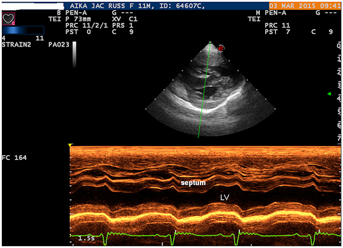 www.frontiersin.orgFigura 2. Vista del eje corto paraesternal derecho: M-MODE que muestra la hipertrofia de la pared ventricular derecha y el aplanamiento sistólico del tabique interventricular. VI: ventrículo izquierdo.