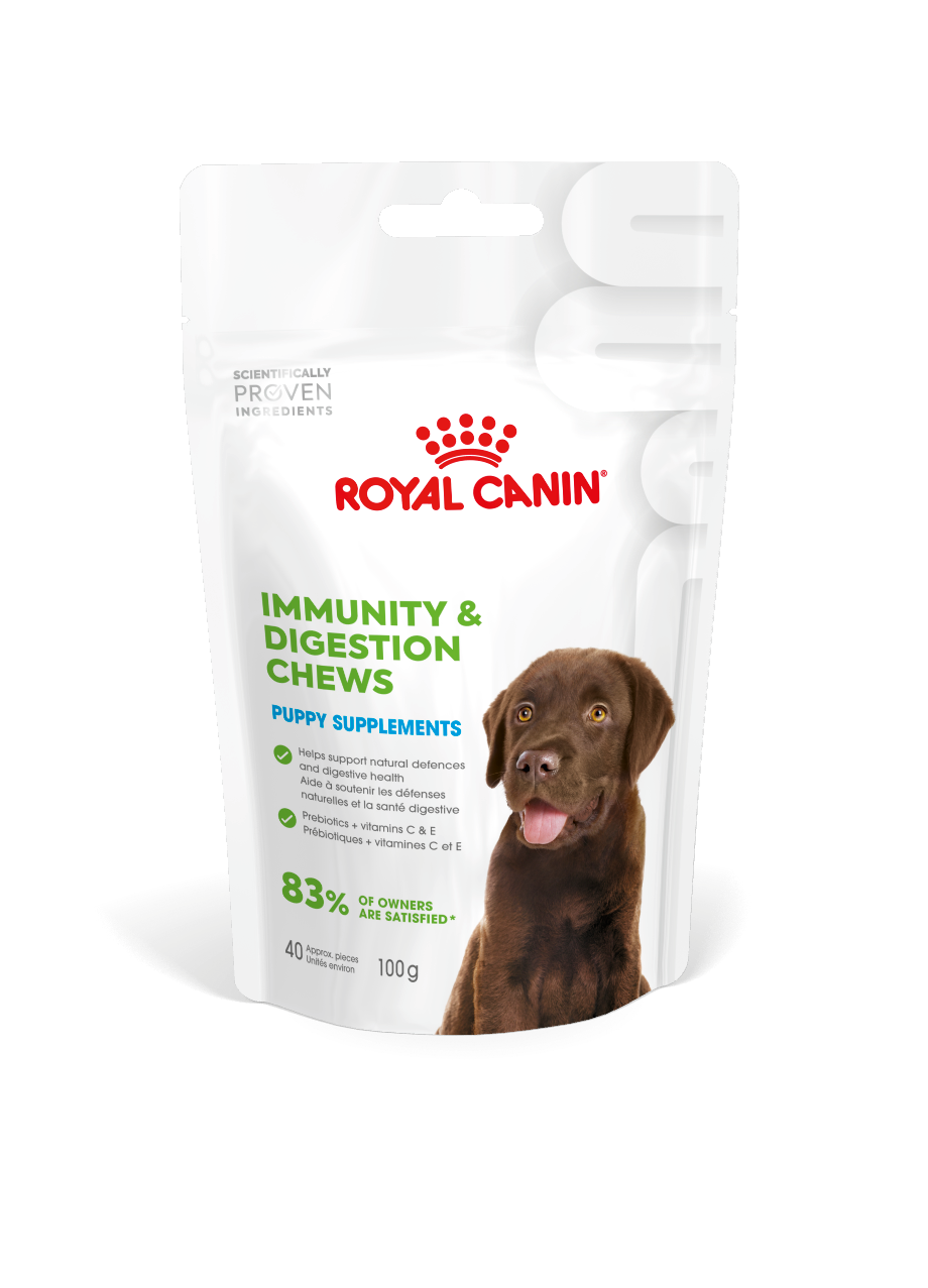 - Suplementos Immunity & Digestion Chews:diseñados para favorecer la inmunidad y la digestión en los cachorros y con vitaminas C y E para ayudar a mantener las defensas naturales y la salud celular, prebióticos para ayudar a mantener un microbioma intestinal saludable y betaglucanos (postbióticos) para favorecer una digestión saludable y la calidad de las heces.