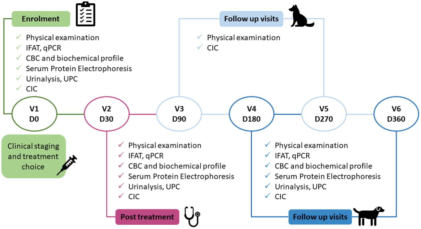 En cada visita se recogieron muestras de sangre para determinar las concentraciones séricas de CIC mediante PEG ELISA (11) (Figura 1). En los días 0, 30, 180 y 360, también se realizaron pruebas de laboratorio de rutina para determinar el estado clínico del perro, que incluyeron hemograma completo (CBC), perfil bioquímico (creatinina, urea y alanina aminotransferasa), electroforesis de proteínas séricas y prueba de anticuerpos de inmunofluorescencia anti-Leishmania (IFAT) (15). Se utilizaron diluciones seriadas de 1:50 a 1:6400 y la seropositividad se definió por un punto de corte ≥1:200. El análisis de orina, incluyendo la densidad de la orina, el análisis de sedimentos y la relación proteína/creatinina (UPC), también se realizaron en los días 0, 30, 180 y 360 en muestras de orina obtenidas preferentemente por cistocentesis, o por captura libre en un recipiente estéril. También se realizó una PCR cuantitativa para confirmar la infección en el día 0 y cuantificar la carga parasitaria a los 6 y 12 meses después de la inscripción. Sobre la base del examen físico y los hallazgos clínico-patológicos, los perros fueron asignados a los estadios I-IV de la enfermedad clínica de LeishVet (3).