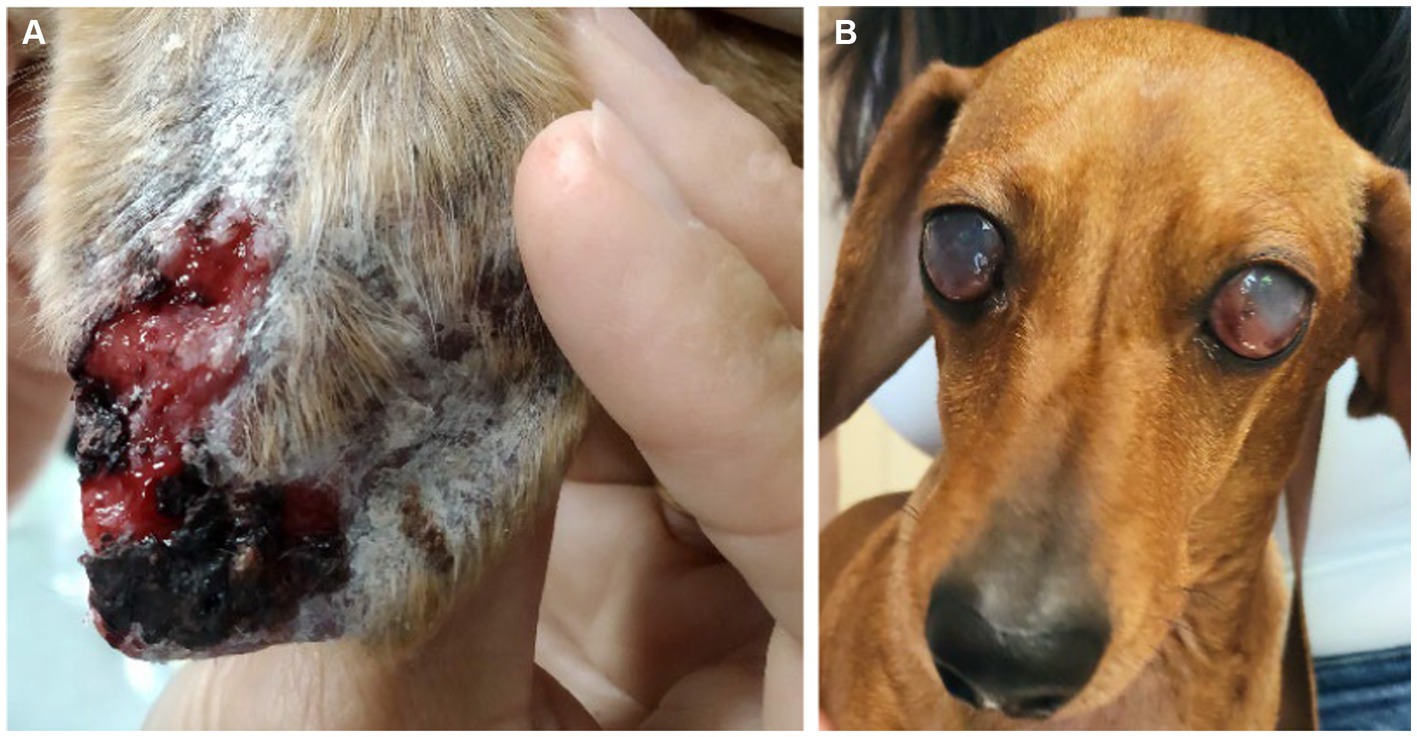 Figura 2. Signos clínicos de depósito de CIC en perros con CanL. (A) Úlcera en el pabellón auricular asociada a vasculitis. (B) Ceguera asociada a uveítis bilateral.