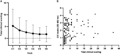Figura 3. (A) Medias y DE de las puntuaciones clínicas totales registradas en cada visita. (B) Correlación entre las puntuaciones clínicas totales y los niveles de CIC (correlación de Spearman, r = 0,5135). V1 (Día 0), V2 (Día 30), V3 (Día 90), V4 (Día 180), V5 (Día 270) y V6 (Día 360).