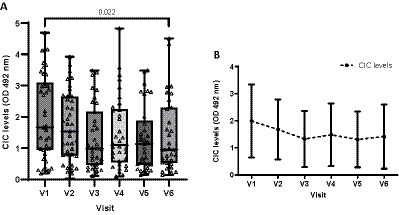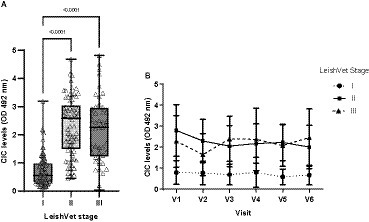 Figura 4. (A) Niveles de CIC registrados en los perros asignados a diferentes estadios de LeishVet (test no paramétrico de Kruskal-Wallis). (B) Cambios en los niveles medios de CIC registrados durante el período de estudio de 12 meses en perros en diferentes etapas de LeishVet. V1 (Día 0), V2 (Día 30), V3 (Día 90), V4 (Día 180), V5 (Día 270) y V6 (Día 360).