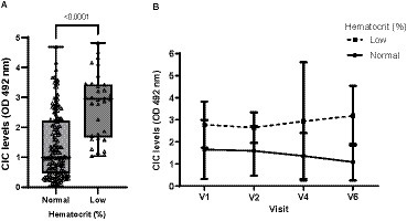 Figura 5. (A) Niveles de CIC registrados en perros con o sin anemia (prueba de Wilcoxon no paramétrica). (B) Cambios en las medias de CIC producidos durante el estudio en perros con o sin anemia. Valor de referencia hematocrito: 37-55%. V1 (Día 0), V2 (Día 30), V3 (Día 90), V4 (Día 180), V5 (Día 270) y V6 (Día 360).