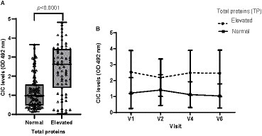 Se detectó hiperproteinemia en el 37,22% de las consultas. Los perros que mostraron hiperproteinemia presentaron niveles significativamente más altos de CIC (p < 0,0001) (Figura 6). En la visita 3, que fue la primera visita de seguimiento después del final del tratamiento, ambos grupos mostraron niveles reducidos de CIC. Sin embargo, en los perros con disproteinemia, estos niveles aumentaron posteriormente, mientras que los perros sin disproteinemia mantuvieron consistentemente niveles más bajos de CIC (Figura 6). Además, se encontró una correlación positiva moderada entre el CIC y los niveles de proteína total (r = 0,533, p < 0,0001).