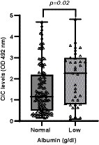 La hipoalbuminemia estuvo presente en el 22,02% de los pacientes. Los perros con hipoalbuminemia mostraron niveles de CIC significativamente más elevados (p = 0,02) (Figura 7), y se encontró una baja correlación negativa entre los niveles de CIC y albúmina (r = −0,306).