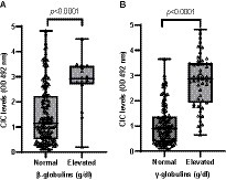Figura 8. (A) Niveles de CIC registrados en perros según la presencia de beta-o (B) gamma-hiperglobulinemia (prueba no paramétrica de Wilcoxon). Valores normales de referencia betaglobulinas: 1,3-2,7 g/dL; gammaglobulinas: 0,5-2 g/dL.