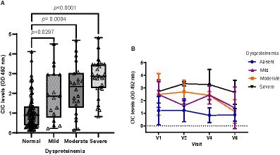 Nuestros hallazgos indican concentraciones séricas elevadas de CIC tanto en perros adultos jóvenes como en aquellos en estadios avanzados de CanL con anemia y/o disproteinemia. Los perros que mostraron una respuesta favorable al tratamiento mostraron una disminución de los niveles de CIC. Por el contrario, los perros que mostraron una respuesta deficiente al tratamiento y las recaídas clínicas recurrentes exhibieron consistentemente altos niveles de CIC. En estos perros, el monitoreo vigilante es esencial para permitir un tratamiento rápido y específico y prevenir daños irreversibles en los órganos debido a la deposición de CIC.