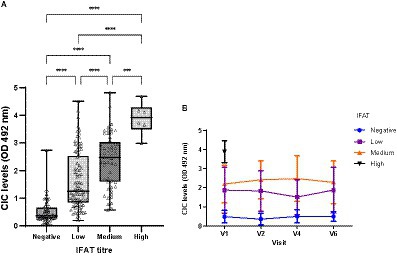 Figura 10. (A) Niveles de CIC registrados en perros que muestran diferentes títulos de anticuerpos contra L. infantum. IFAT < 200 negativo, 200-400 bajo, 800-1600 medio, >1600 alto (prueba de Kruskal-Wallis no paramétrica; p < 0,0005, p < 0,0001). (B) Cambios en las medias de CIC producidos durante el estudio en perros que muestran diferentes títulos de anticuerpos contra L. infantum. Los títulos altos no se muestran debido al bajo número detectado. V1 (Día 0), V2 (Día 30), V4 (Día 180) y V6 (Día 360).*******