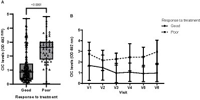 Los buenos respondedores tuvieron niveles de CIC significativamente más bajos en comparación con los malos respondedores (p < 0,0001), que disminuyeron progresivamente a lo largo del curso del estudio. En los pacientes con mala respuesta, aunque se observó una reducción de la CIC después del tratamiento, los niveles aumentaron progresivamente hasta 90 días después del tratamiento. Estos resultados sugieren que la medición de los niveles de CIC antes y después del tratamiento podría servir para evaluar la efectividad del tratamiento.