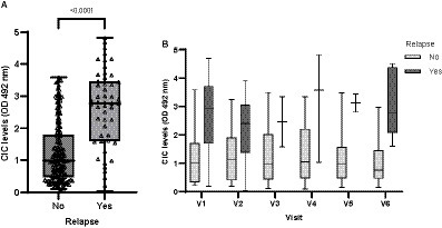Figura 13. (A) Niveles de CIC registrados en perros que experimentan o no recaída (prueba de Wilcoxon no paramétrica). (B) Niveles de CIC registrados durante el período de estudio en perros que experimentan o no recaídas. V1 (Día 0), V2 (Día 30), V3 (Día 90), V4 (Día 180), V5 (Día 270) y V6 (Día 360).